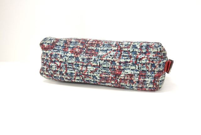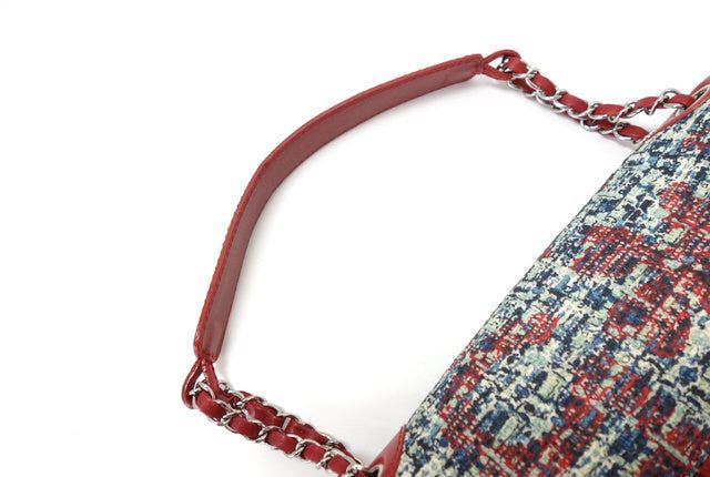 Chanel Red Leather Blue Multicolor Tweed Shoulder Bag. All available information is listed in the description and shown in the photos. Chanel shoulder bag is made of white-and-blue tweed fabric printed with subtle red symbols (a camellia flower, the number 5, and a four-leaf clover) and red leather details, this bag secures with a silver-tone interlocking CC logo turnlock. The interior is lined in white logo jacquard fabric with one zipped pocket, while up above complete with the chain-and-leather strap. 11"L x 4"W x 6.5"H, Shoulder Strap Drop 6.5"