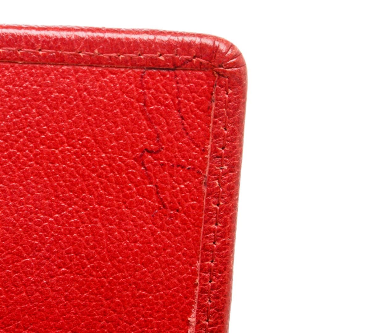 One Chanel Red Leather Camelia CC Flap Long Wallet. Red leather Chanel Camelia CC flap long wallet with silver tone hardware, red and gray leather and fabric interior lining, six credit card slots, one bill pocket, three compartments one with zipper closure and overall flap with snap button closure. MKX
