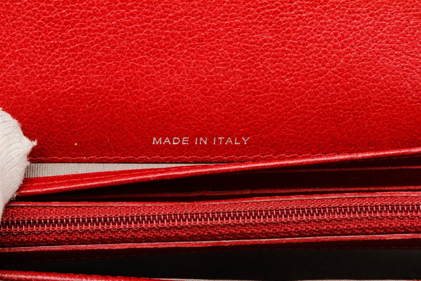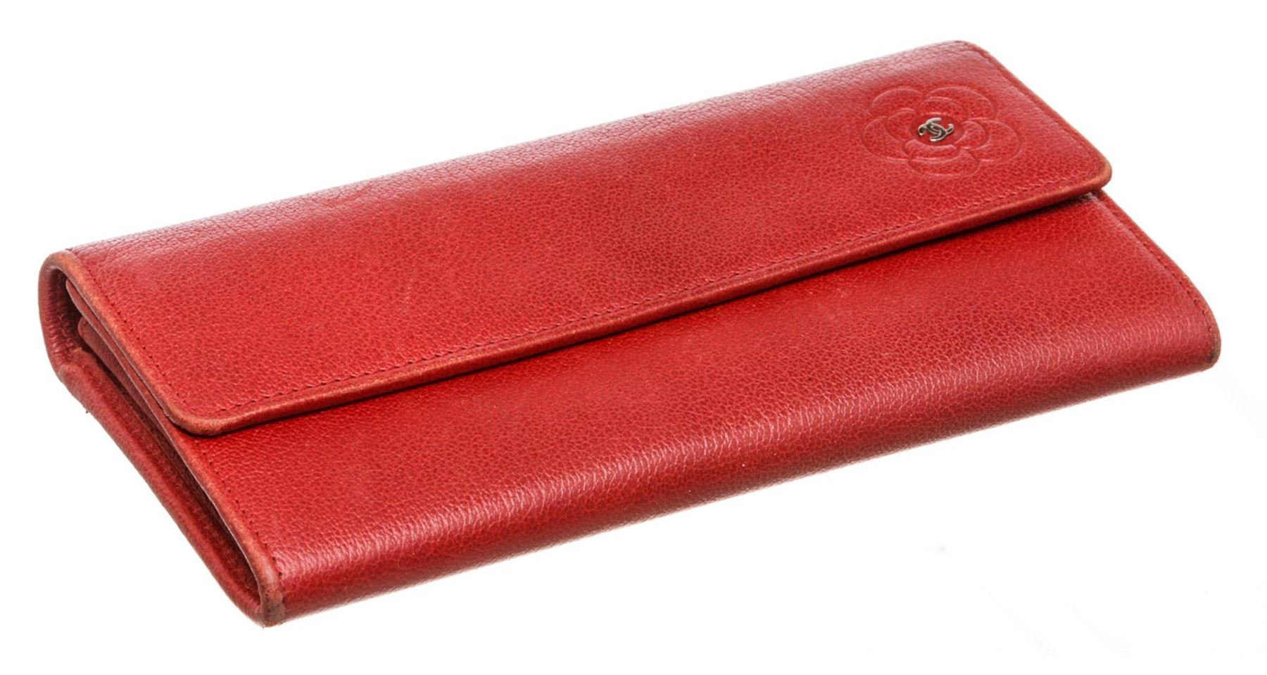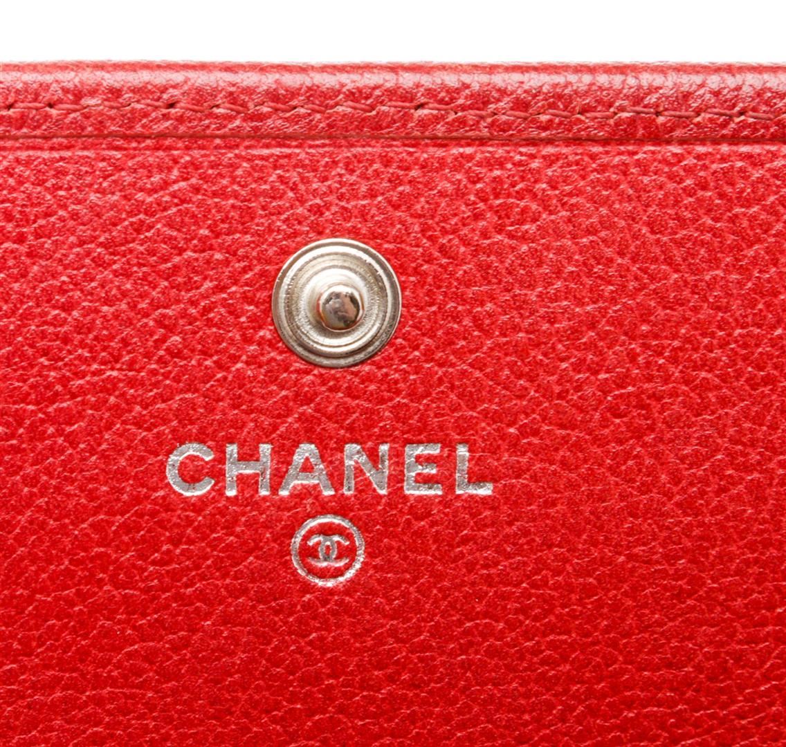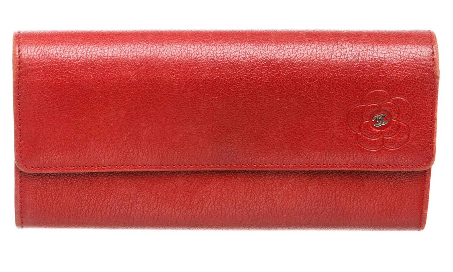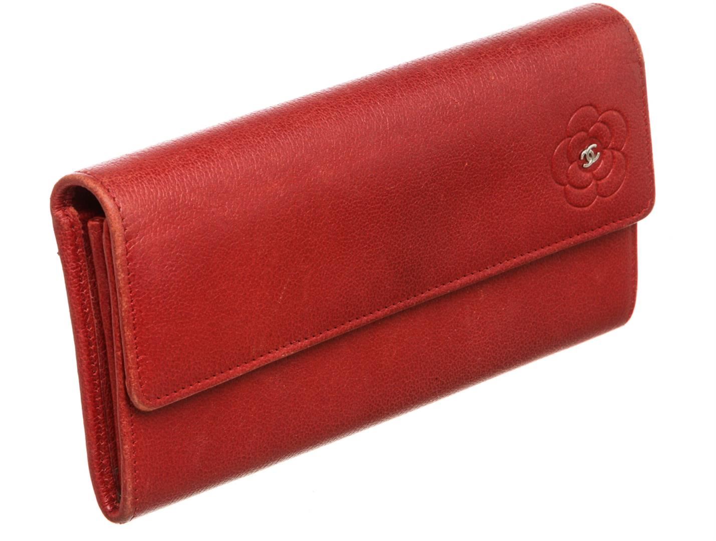 One Chanel Red Leather Camelia CC Flap Long Wallet. Red leather Chanel Camelia CC flap long wallet with silver tone hardware, red and gray leather and fabric interior lining, six credit card slots, one bill pocket, three compartments one with zipper closure and overall flap with snap button closure.         MKX