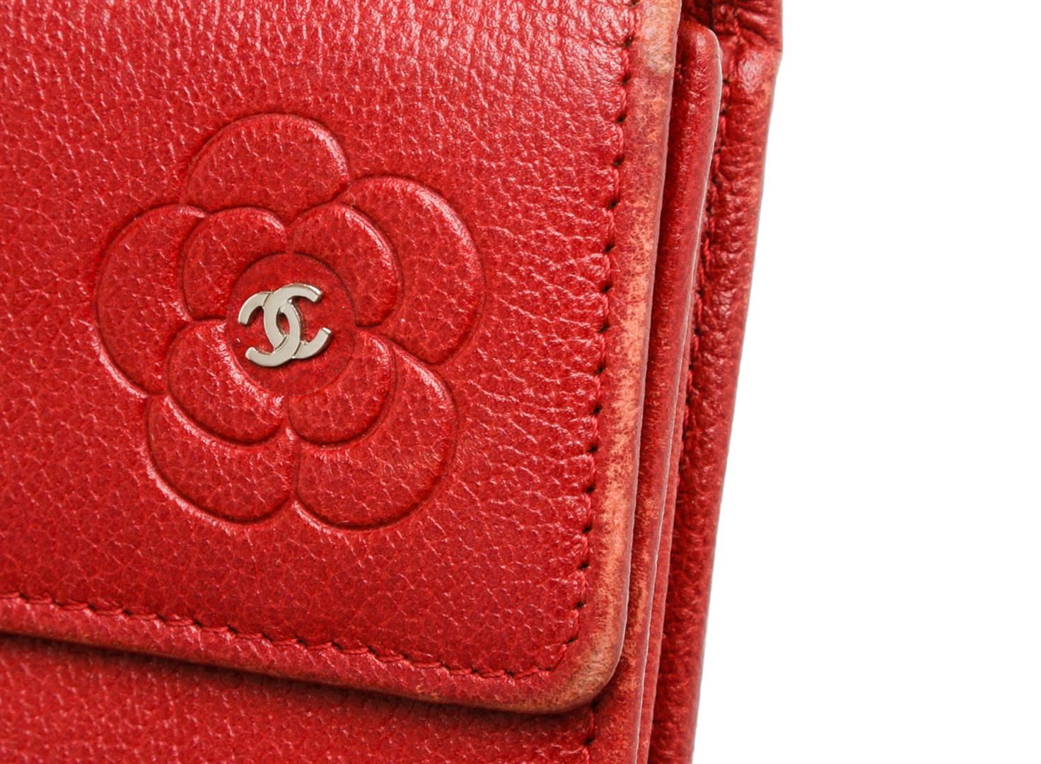 One Chanel Red Leather Camelia CC Flap Long Wallet. Red leather Chanel Camelia CC flap long wallet with silver tone hardware, red and gray leather and fabric interior lining, six credit card slots, one bill pocket, three compartments one with zipper closure and overall flap with snap button closure. MKX