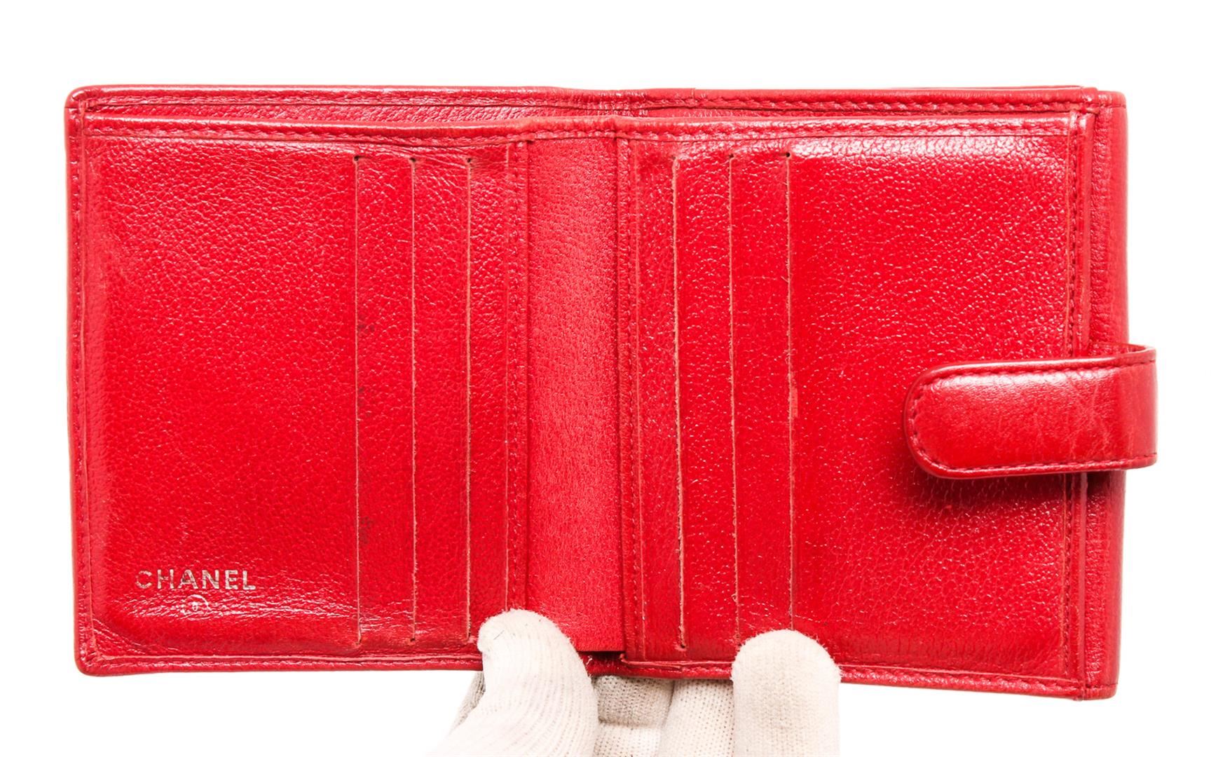Red leather Chanel compact wallet with camellia accent, silver-tone CC logo at exterior trim, exterior compartment with snap closure, tonal leather lining, six card slots, dual interior pockets, single bill compartment and snap closure at top.