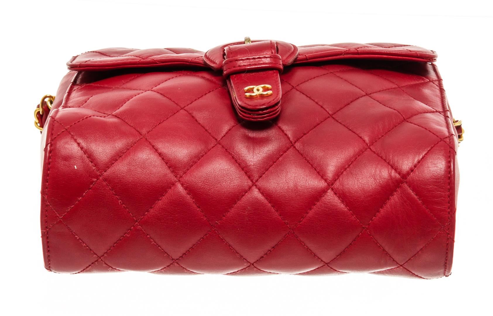 Chanel Red Leather Chain Buckle Flap Shoulder Bag. All available information is listed in the description and shown in the photos. Chanel red leather chain buckle flap shoulder bag with red quilted leather exterior, red leather lining, gold-tone hardware, a long chain with shoulder pad, buckle closure, one main compartment, and one interior zip pocket. There is a scratch on the front, peeling on the lining. Please refer to photos. Body is vintage and body has a chunky feel to it.