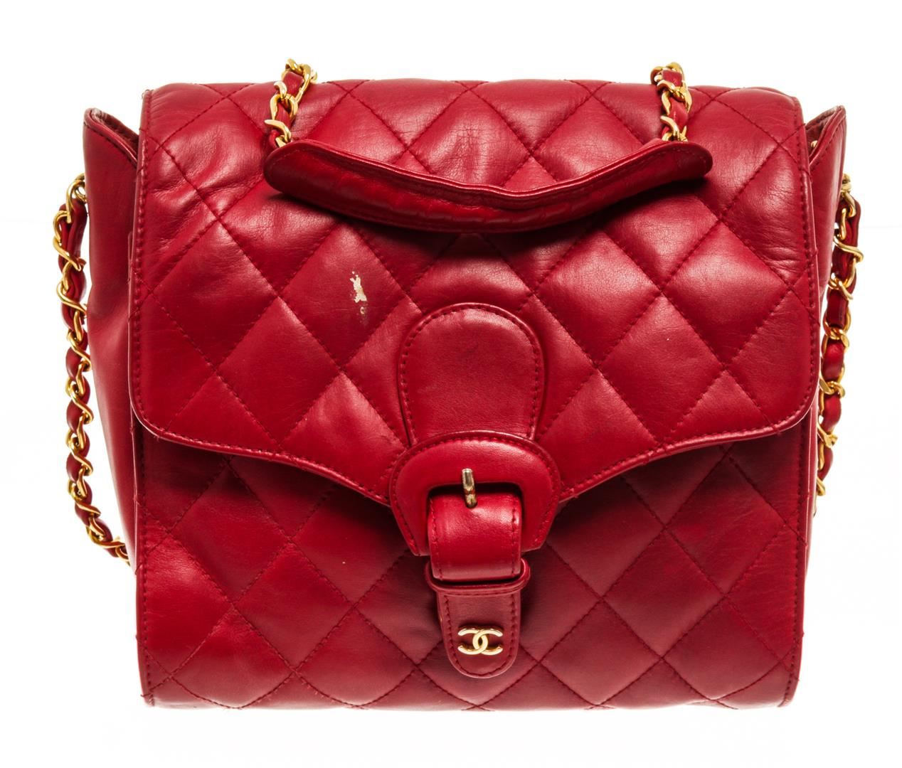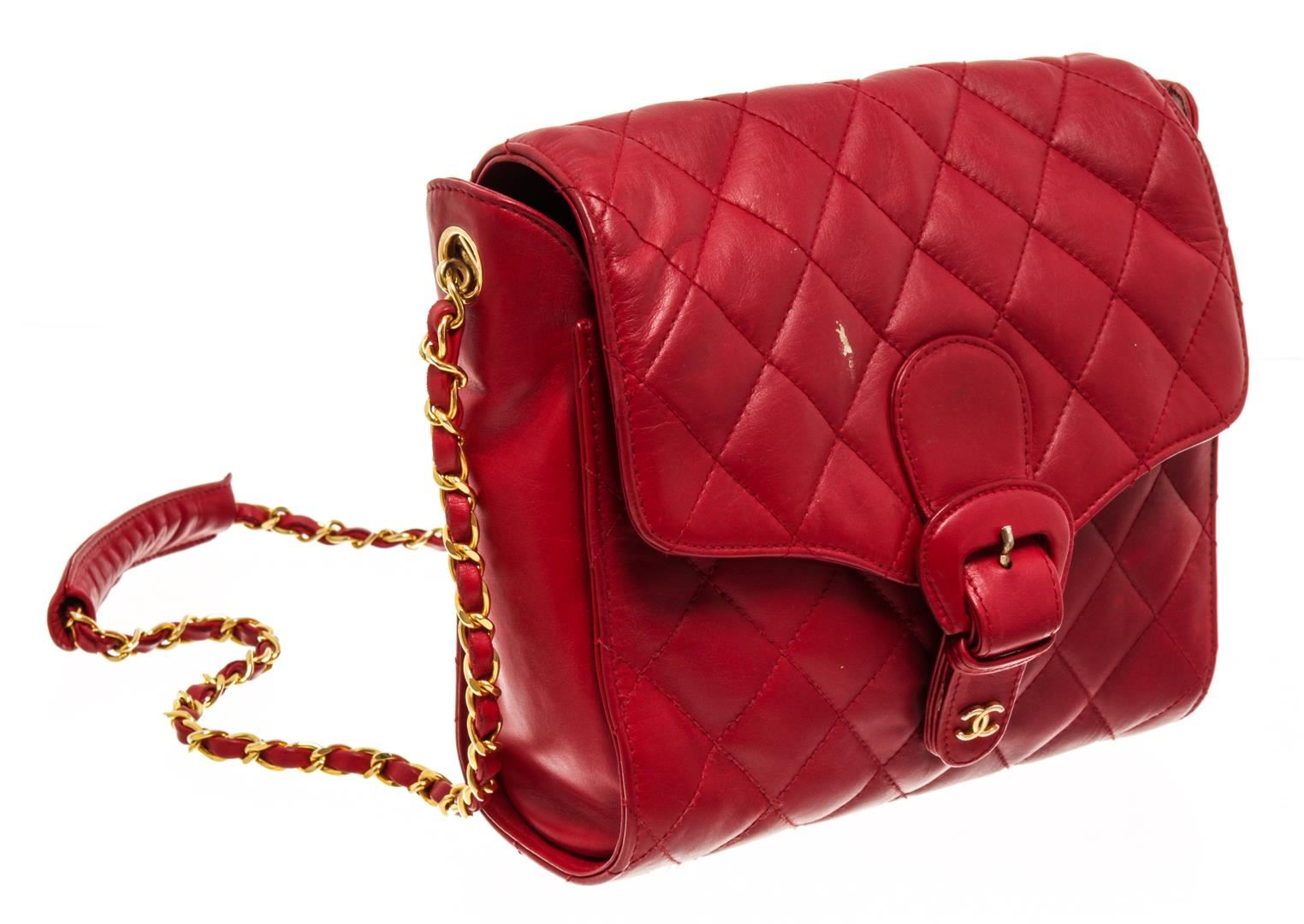 Chanel Red Leather Chain Buckle Flap Shoulder Bag. All available information is listed in the description and shown in the photos. Chanel red leather chain buckle flap shoulder bag with red quilted leather exterior, red leather lining, gold-tone hardware, a long chain with shoulder pad, buckle closure, one main compartment, and one interior zip pocket. There is a scratch on the front, peeling on the lining. Please refer to photos. Body is vintage and body has a chunky feel to it.
