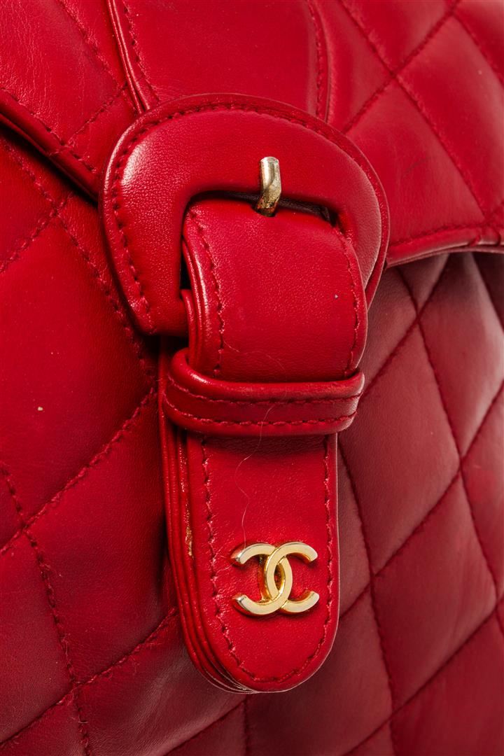 Chanel Red Leather Chain Buckle Flap Shoulder Bag. All available information is listed in the description and shown in the photos. Chanel red leather chain buckle flap shoulder bag with red quilted leather exterior, red leather lining, gold-tone hardware, a long chain with shoulder pad, buckle closure, one main compartment, and one interior zip pocket. There is a scratch on the front, peeling on the lining. Please refer to photos. Body is vintage and body has a chunky feel to it.