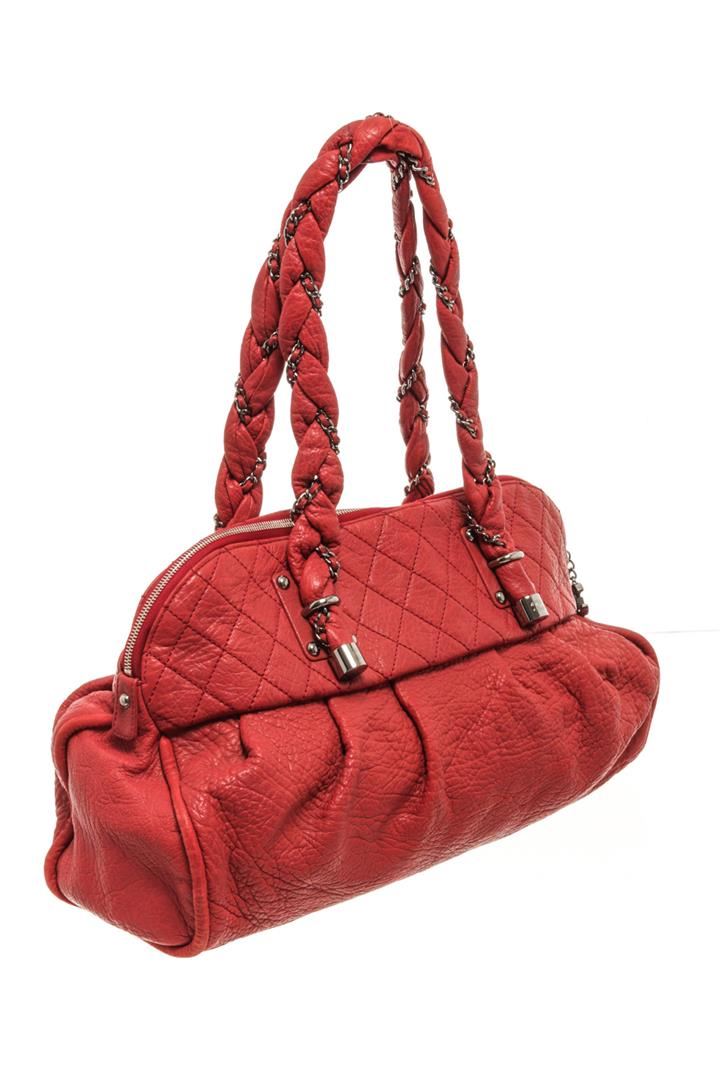 One Chanel Red Leather Large Lady Braid Bowler Bag. Item is sold AS-IS. All available information is listed in the description and shown in the photo. Chanel red leather large lady braid bowling bag with red lambskin exterior, silver-tone hardware, dual leather-chain shoulder straps, brown satin lining, zip closure, interlocking CC logo on the zipper tab, and two interior pockets: one zip and one slip. Height: 12 in (30.48 cm), Width: 18 in (45.72 cm), Depth: 5.5 in (13.97 cm)