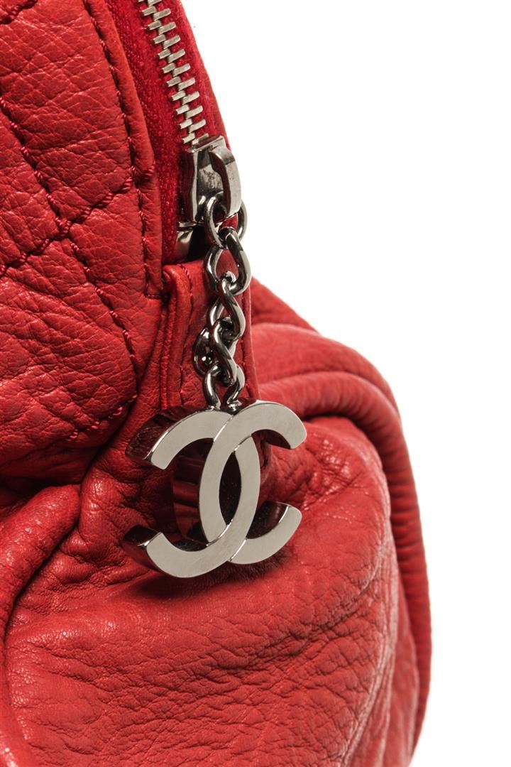 One Chanel Red Leather Large Lady Braid Bowler Bag. Item is sold AS-IS. All available information is listed in the description and shown in the photo. Chanel red leather large lady braid bowling bag with red lambskin exterior, silver-tone hardware, dual leather-chain shoulder straps, brown satin lining, zip closure, interlocking CC logo on the zipper tab, and two interior pockets: one zip and one slip. Height: 12 in (30.48 cm), Width: 18 in (45.72 cm), Depth: 5.5 in (13.97 cm)