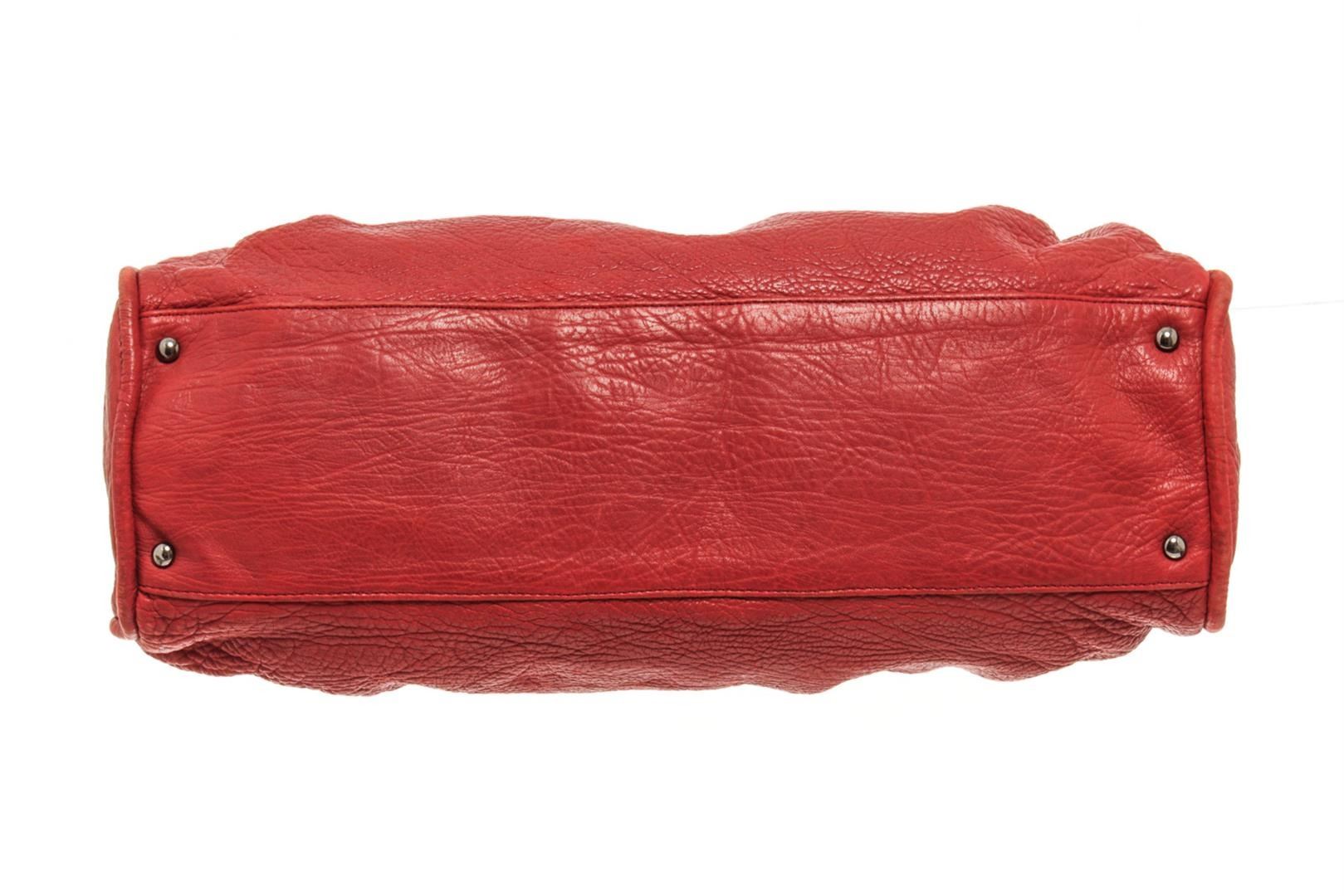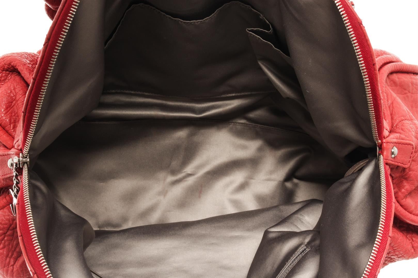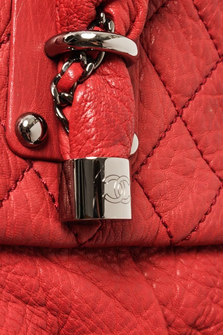 One Chanel Red Leather Large Lady Braid Bowler Bag. Item is sold AS-IS. All available information is listed in the description and shown in the photo. Chanel red leather large lady braid bowling bag with red lambskin exterior, silver-tone hardware, dual leather-chain shoulder straps, brown satin lining, zip closure, interlocking CC logo on the zipper tab, and two interior pockets: one zip and one slip. Height: 12 in (30.48 cm), Width: 18 in (45.72 cm), Depth: 5.5 in (13.97 cm)