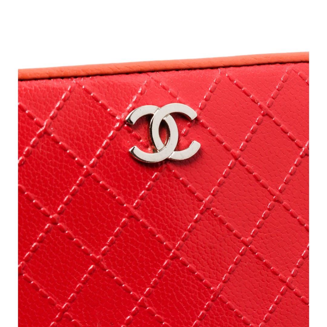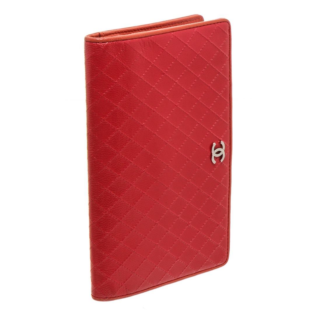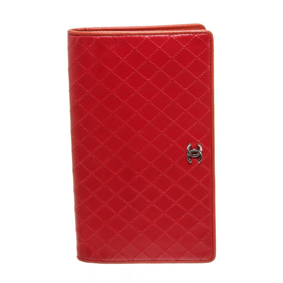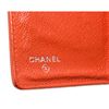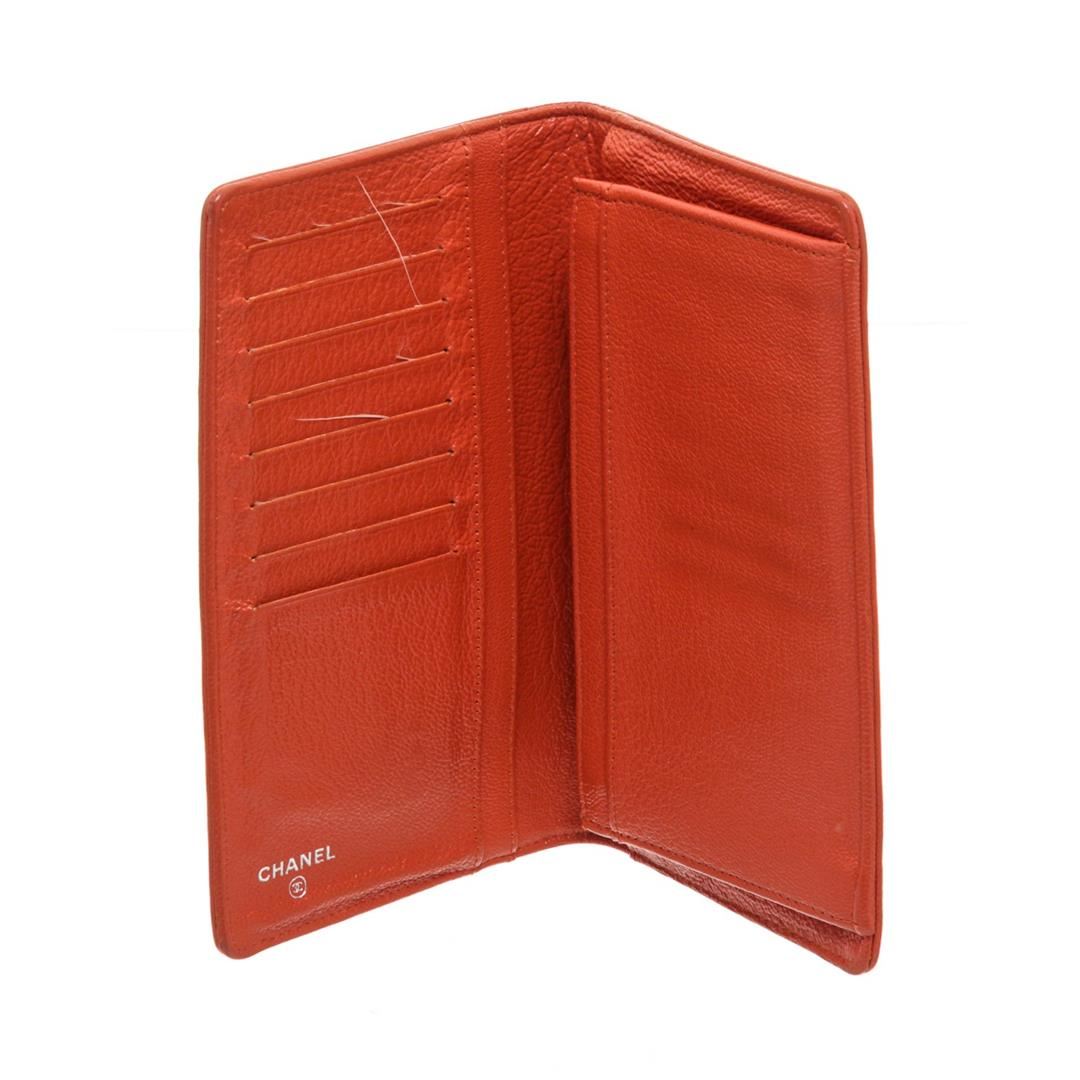 Red orange leather Chanel stitched bifold long wallet with eight credit card pockets, five bill compartments and one zipper pocket. Authentic.