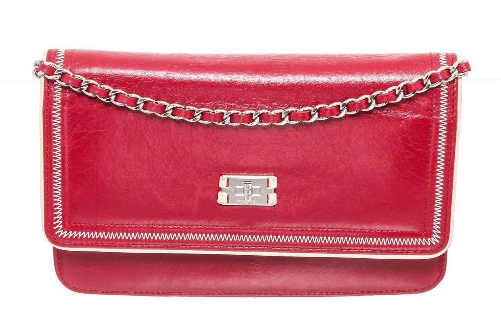 Chanel red leather wallet on a chain with silver-tone hardware, single chain shoulder strap, tan canvas interior lining, five interior pockets; two with zip closure, card holder slots, overall snap closure on front. Measurements: Length: 7.95 in / 20 cm Width: 1.5 in / 4 cm 5 in / 13 cmCONDITION: Pre-Owned Good overall condition. Please refer to photographs.
