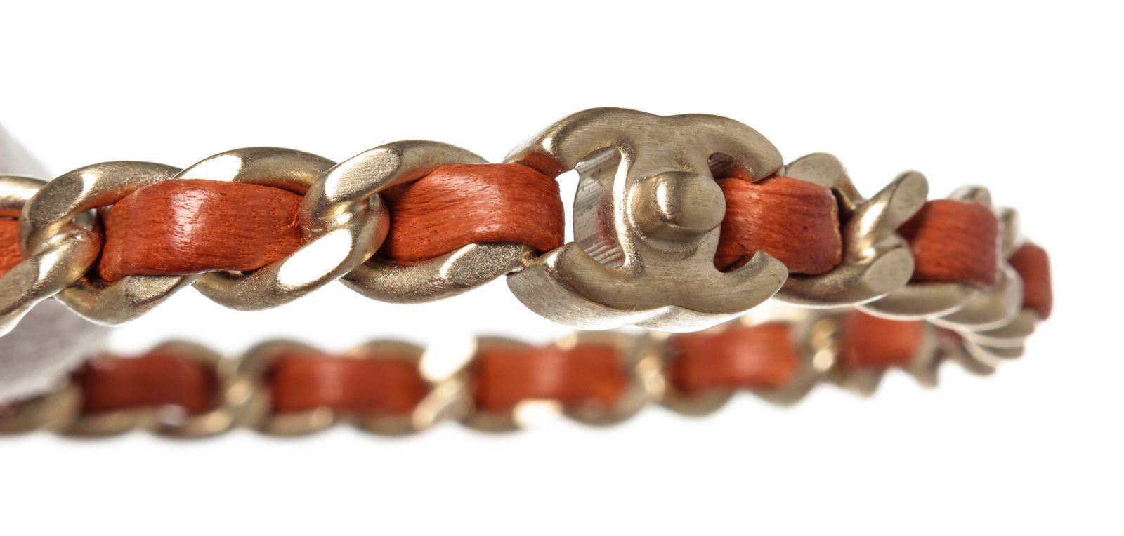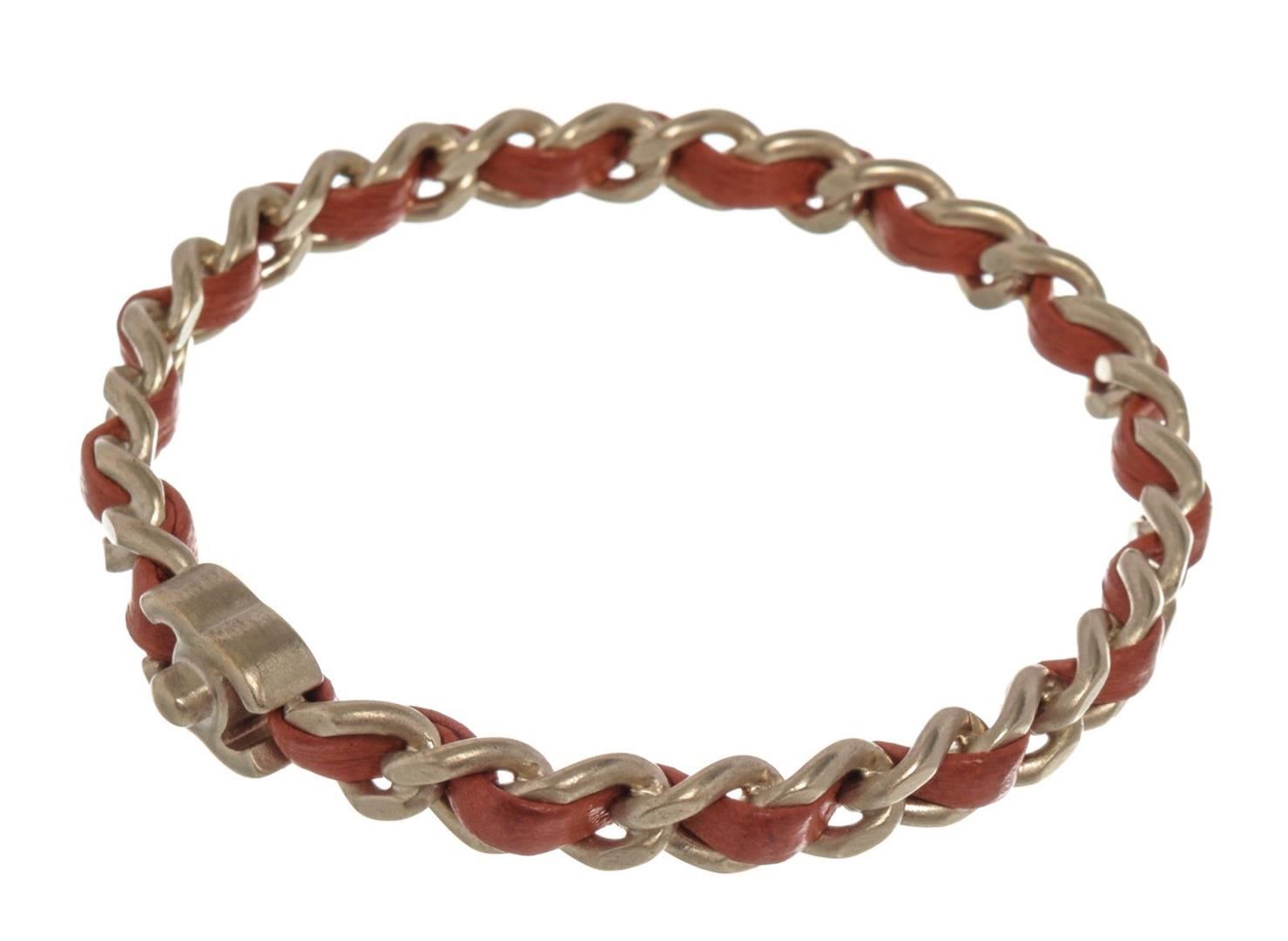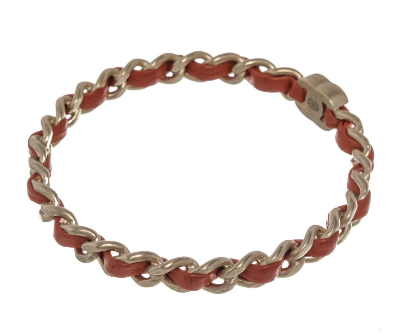 Red leather woven chain-link Chanel CC bangle bracelet with CC logo and silver-tone hardware.