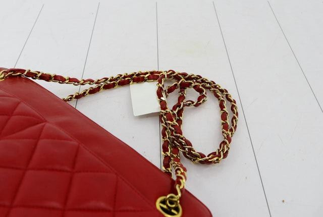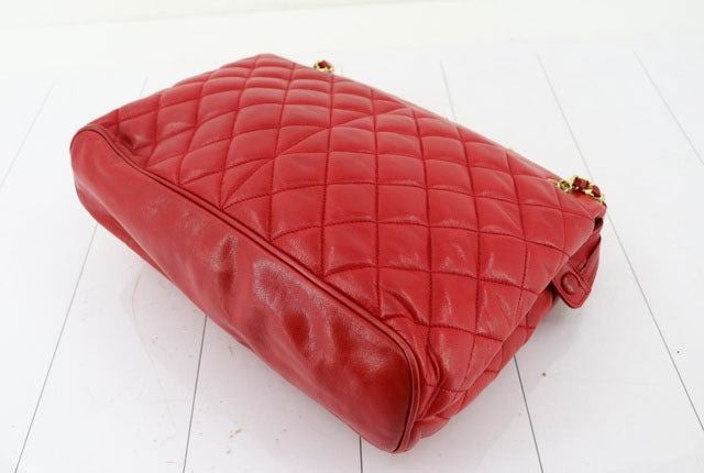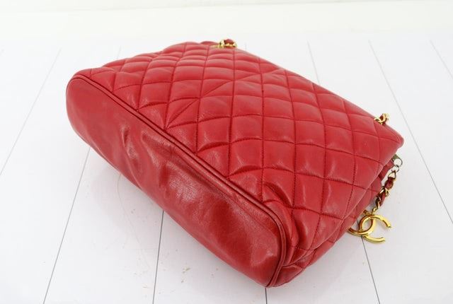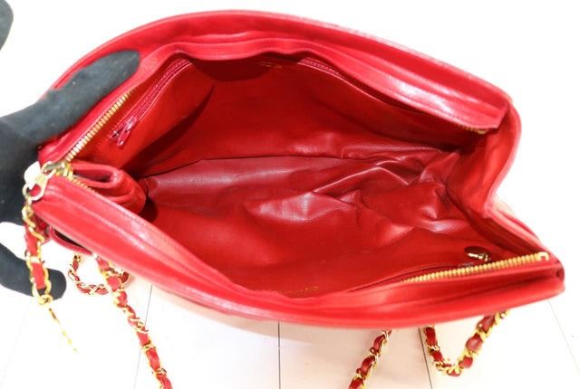 Chanel Red Quilted Lambskin Leather Matelasse Chain Shoulder Bag. All available information is listed in the description and shown in the photos. Chanel Matelasse Shoulder Bag in red quilted Lambskin leather, gold-tone hardware, two open pockets at front, chain shoulder strap intertwined with red leather, zipper closure at top main compartment and red leather interior lining with one zipped pocket inside. W21 × H12 × D5.5cm (W8.2" × H4.7" × D2.1") / Strap drop:57cm (22.4")