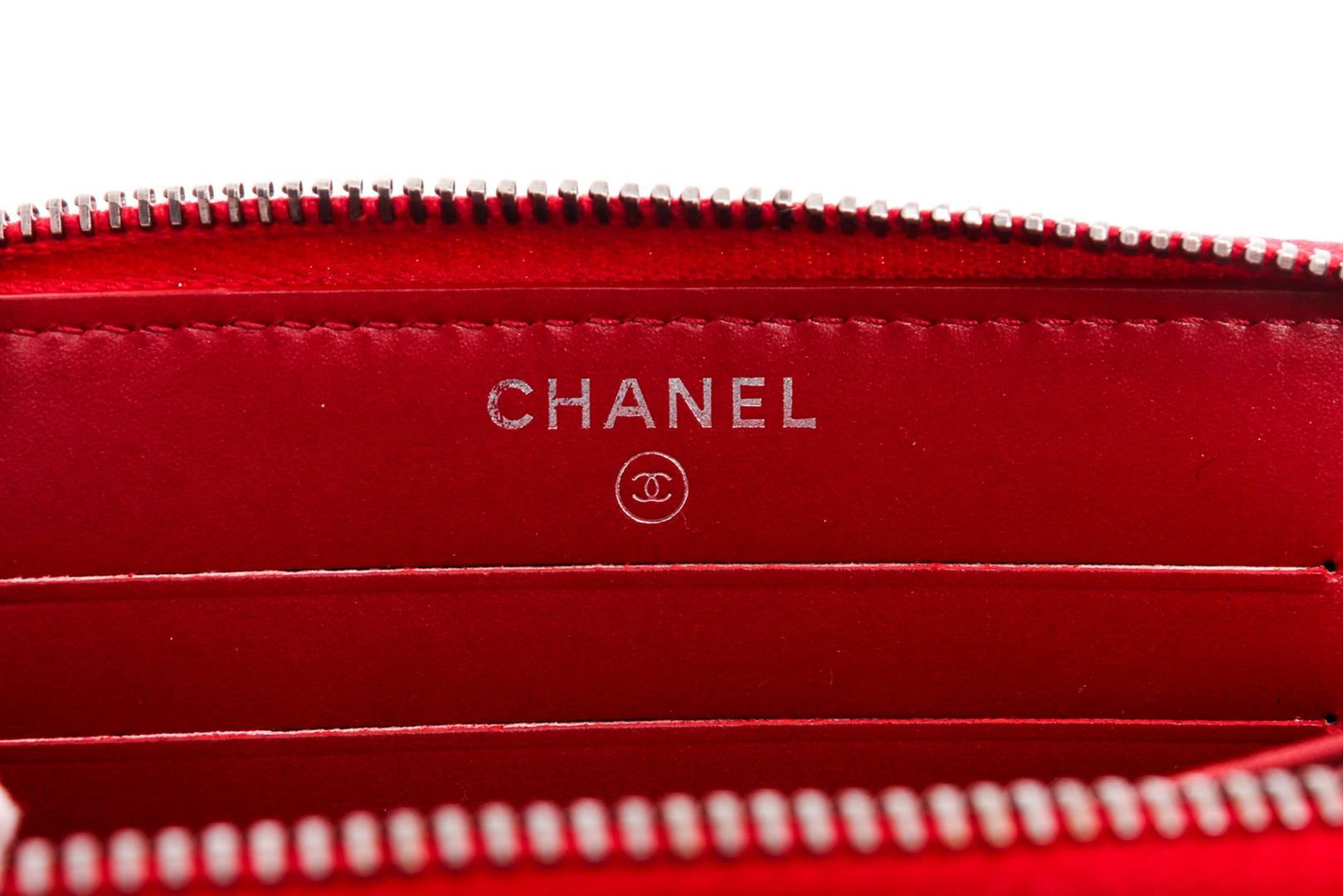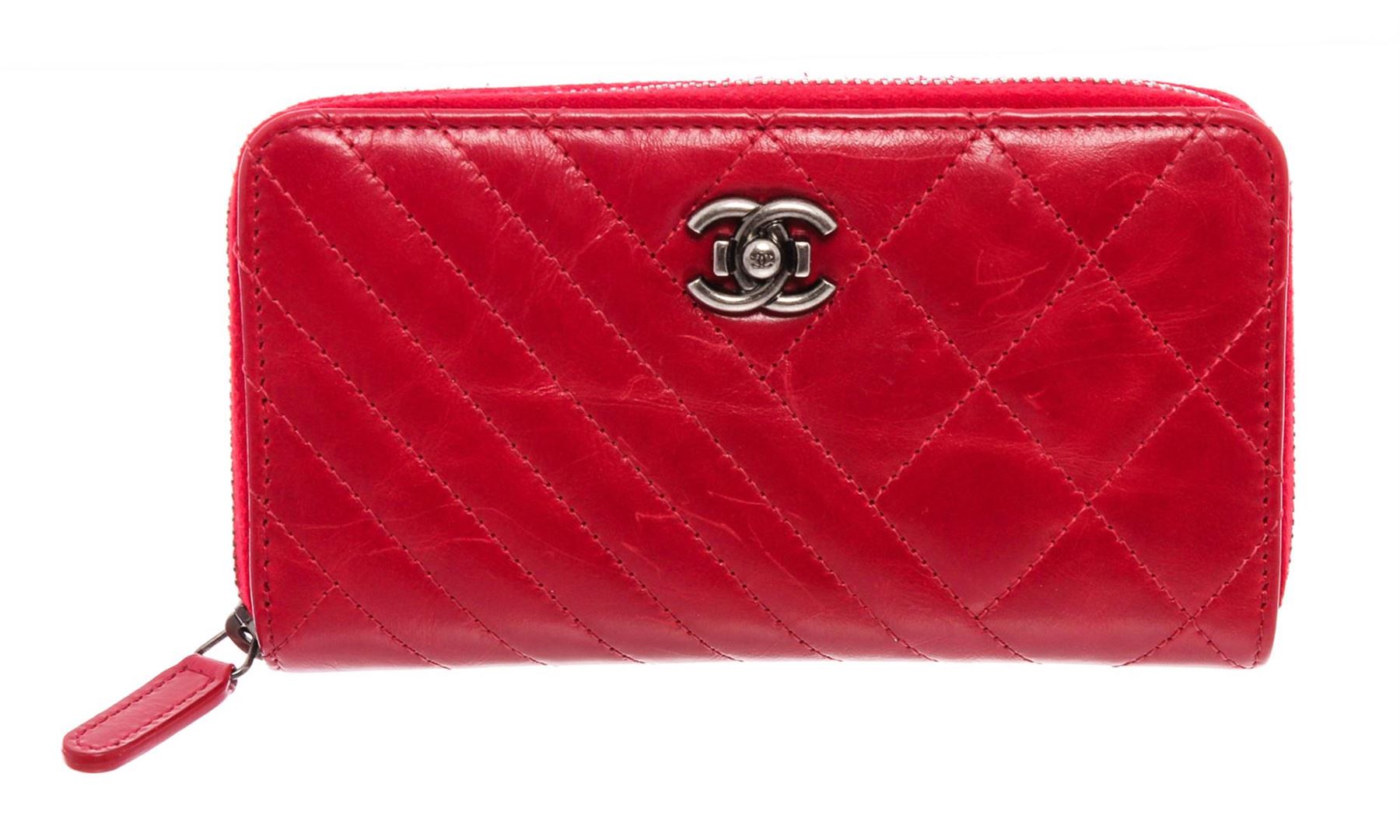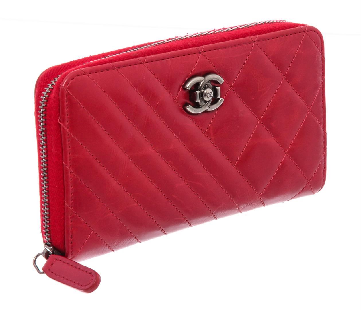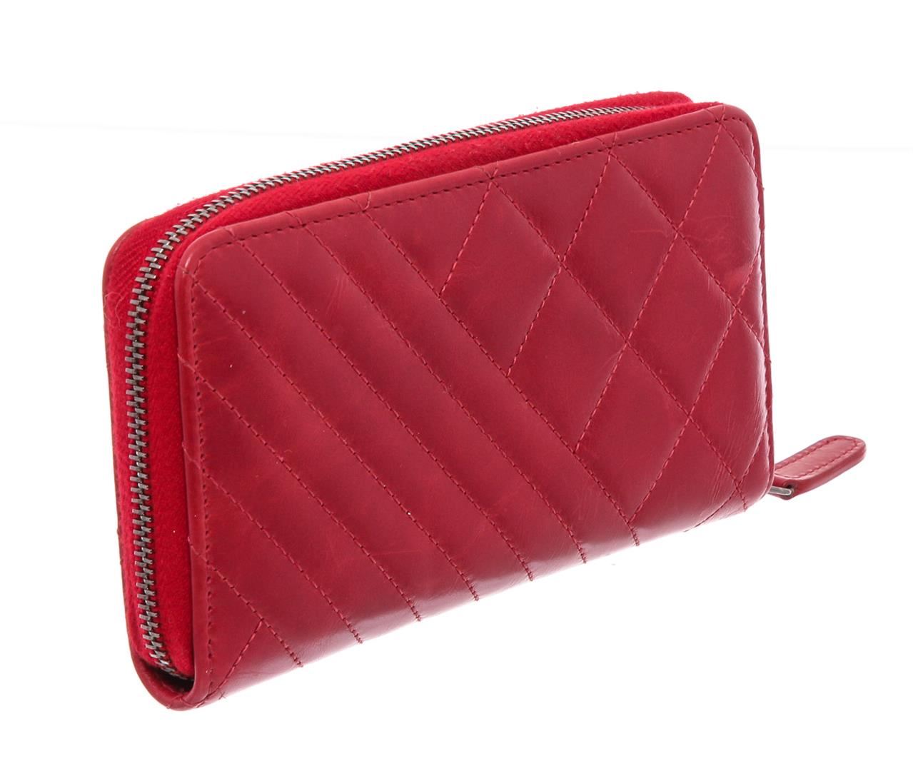 Red quilted leather Chanel Coco Boy wallet with antiqued silver-tone hardware, CC logo adornment at front, three interior compartments; one with zip closure, tonal woven lining, dual bill compartments, eight card slots and zip-around closure at exterior.