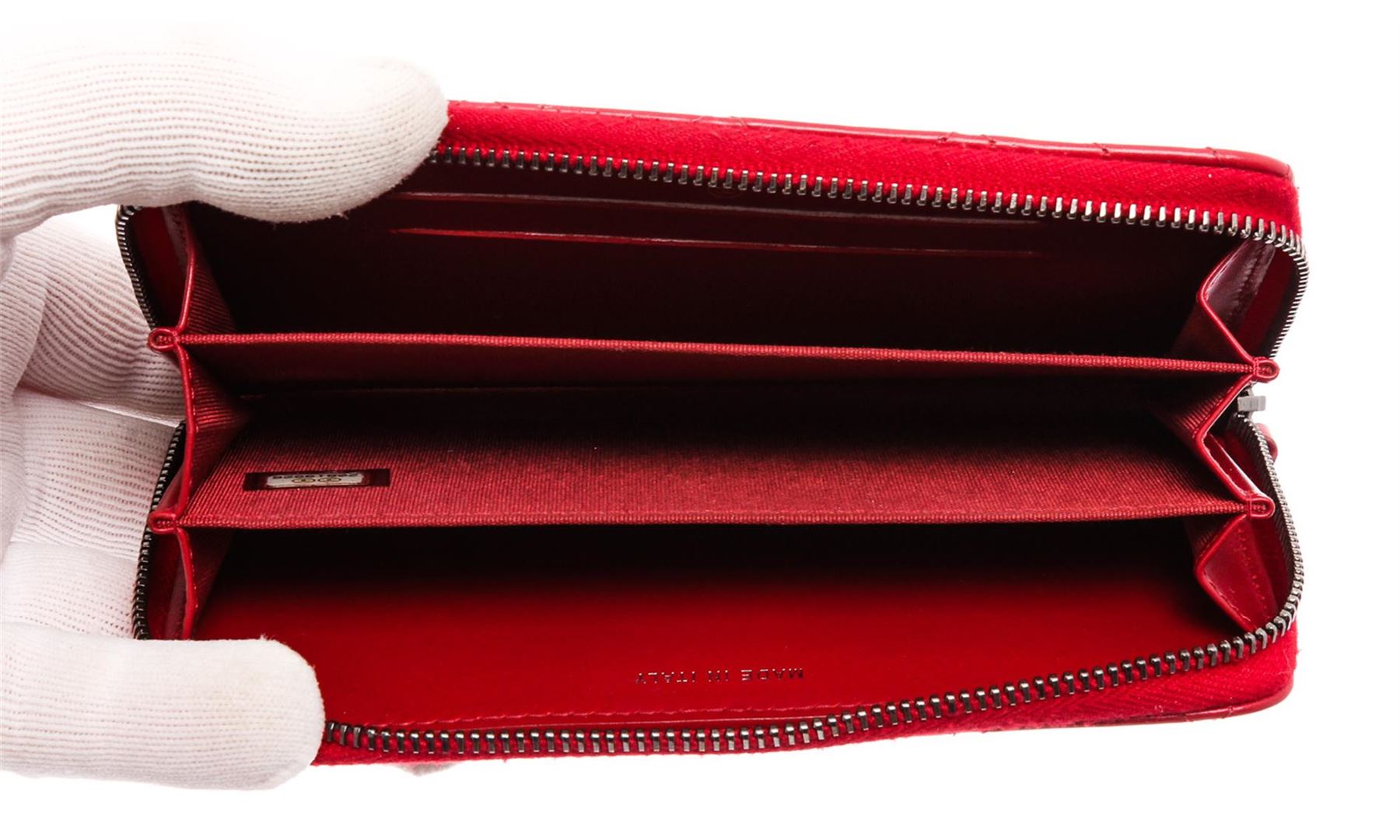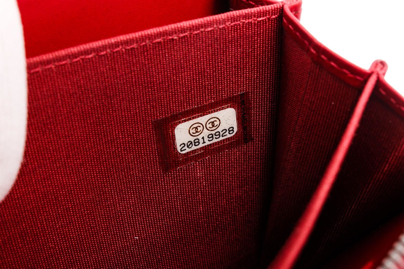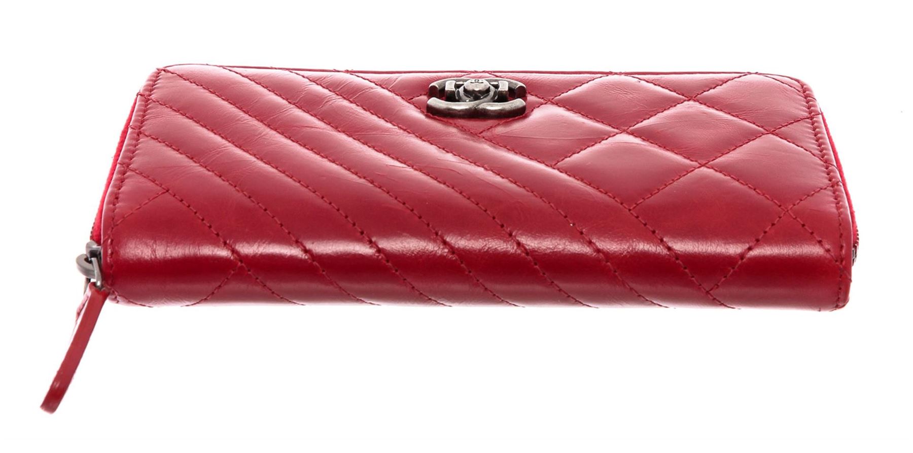 Red quilted leather Chanel Coco Boy wallet with antiqued silver-tone hardware, CC logo adornment at front, three interior compartments; one with zip closure, tonal woven lining, dual bill compartments, eight card slots and zip-around closure at exterior.