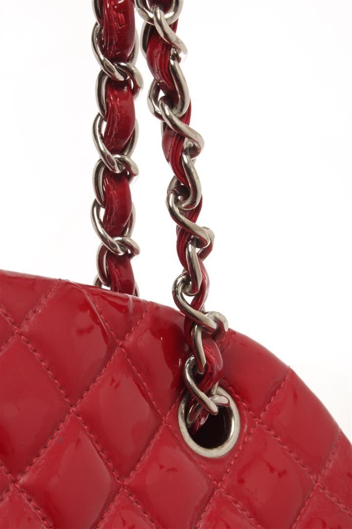 Chanel Red Quilted Patent Bowling Chain Shoulder Bag. All available information is listed in the description and shown in the photos. patent leather threaded silver shoulder straps with patent leather shoulder pads and a dangling silver Chanel CC medallion. The top is open to red fabric multiple compartments with a zippered closure. Height: 5.25 in, Width: 4.50 in, length: 10.50 in/ 13.33 x 11.43 x 26.67 CM