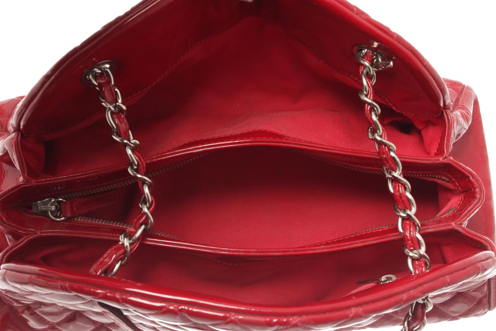 Chanel Red Quilted Patent Bowling Chain Shoulder Bag. All available information is listed in the description and shown in the photos. patent leather threaded silver shoulder straps with patent leather shoulder pads and a dangling silver Chanel CC medallion. The top is open to red fabric multiple compartments with a zippered closure. Height: 5.25 in, Width: 4.50 in, length: 10.50 in/ 13.33 x 11.43 x 26.67 CM