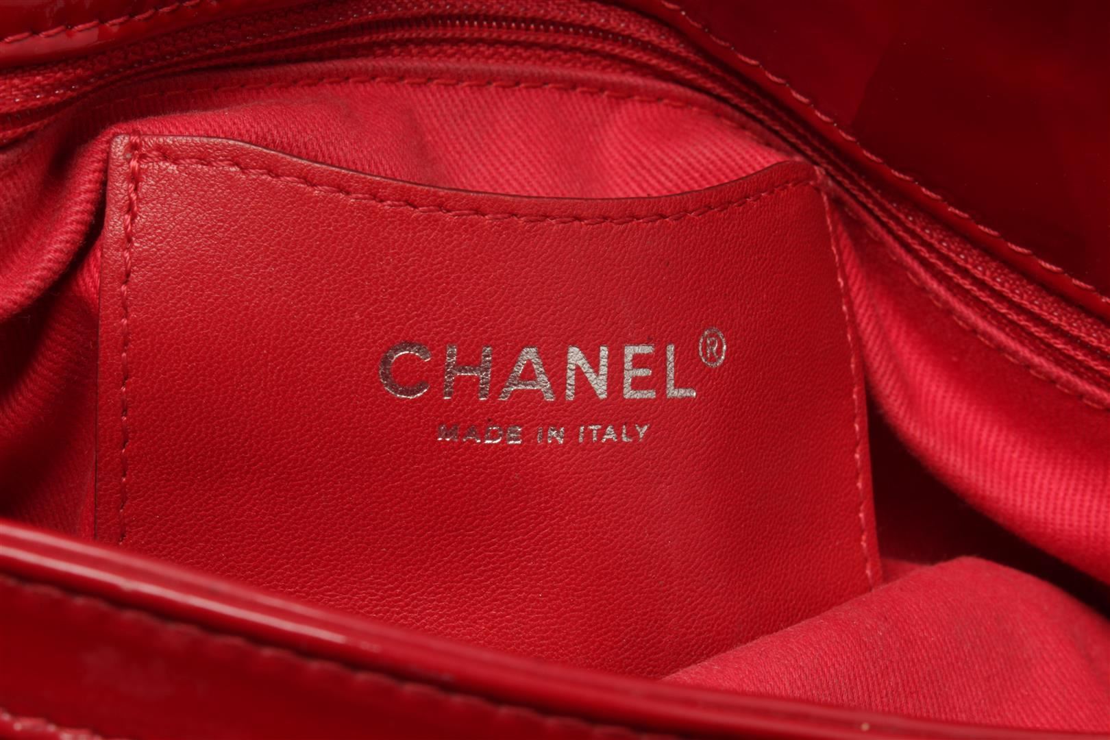 Chanel Red Quilted Patent Bowling Chain Shoulder Bag. All available information is listed in the description and shown in the photos. patent leather threaded silver shoulder straps with patent leather shoulder pads and a dangling silver Chanel CC medallion. The top is open to red fabric multiple compartments with a zippered closure. Height: 5.25 in, Width: 4.50 in, length: 10.50 in/ 13.33 x 11.43 x 26.67 CM