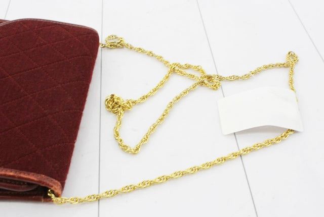 Chanel Flap shoulder bag features red quilted tweed body, gold-tone hardware, small interlocking CC logo at front, flap with magnetic snap closure, red leather trim, black canvas lining and long chain-link shoulder strap. Height 13cm Width 17cm Dept