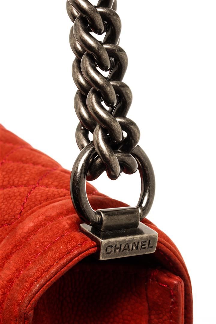 One Chanel Red Soft Matte Caviar Leather Boy Large Flap Bag. Item is sold AS-IS. All available information is listed in the description and shown in the photo. Chanel Red Soft Matte Caviar Leather Boy Large Flap Bag with aged silver-tone hardware, red canvas lining, interior slip and zipper pockets, chain leather shoulder strap, and flap closure with CC push lock. .