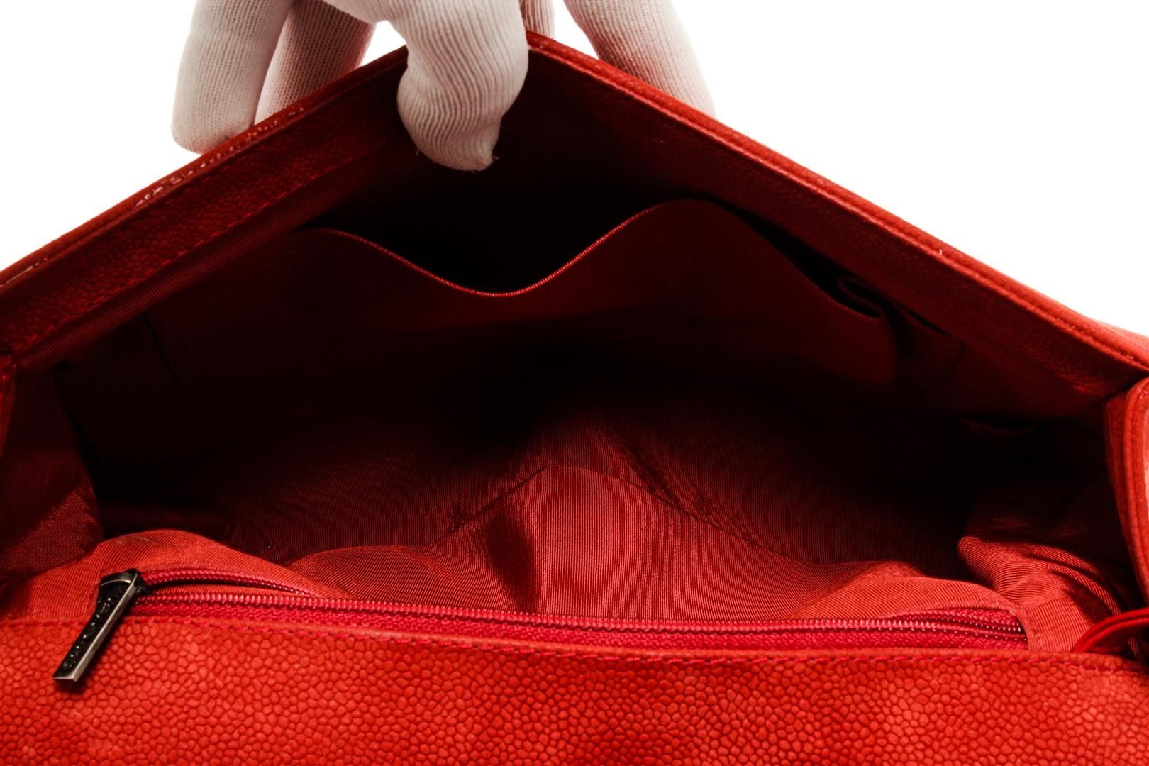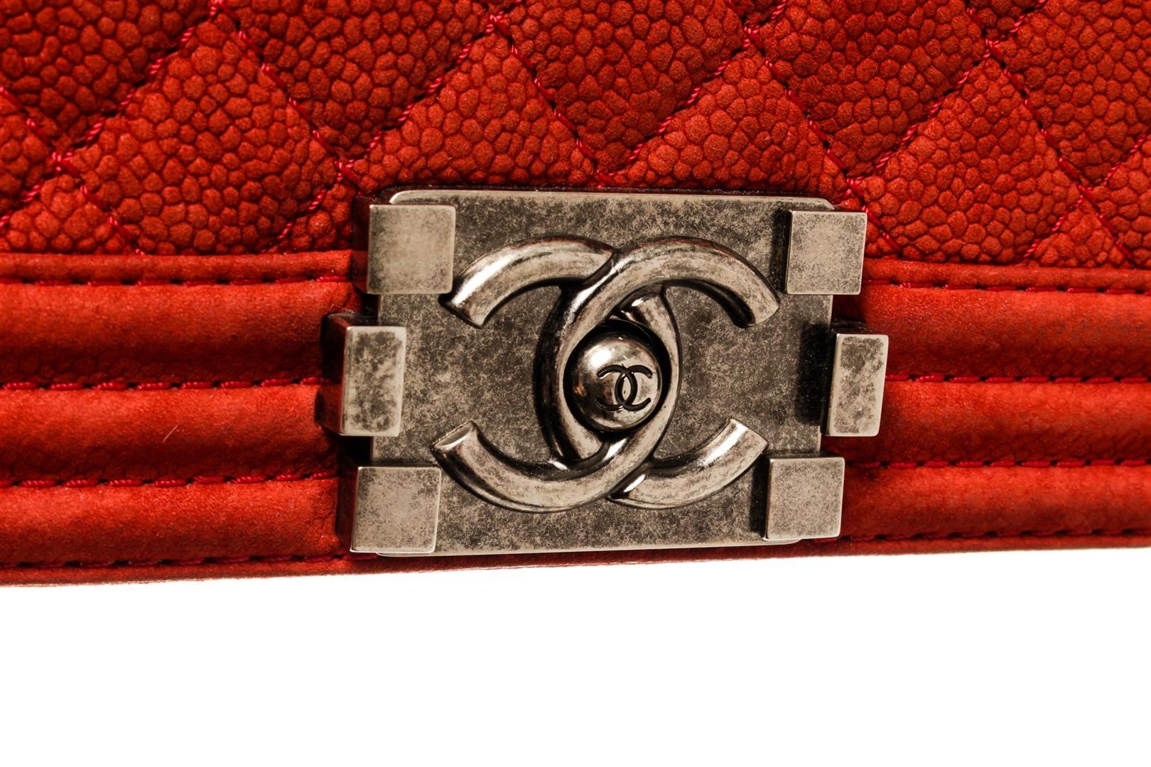 One Chanel Red Soft Matte Caviar Leather Boy Large Flap Bag. Item is sold AS-IS. All available information is listed in the description and shown in the photo. Chanel Red Soft Matte Caviar Leather Boy Large Flap Bag with aged silver-tone hardware, red canvas lining, interior slip and zipper pockets, chain leather shoulder strap, and flap closure with CC push lock. .