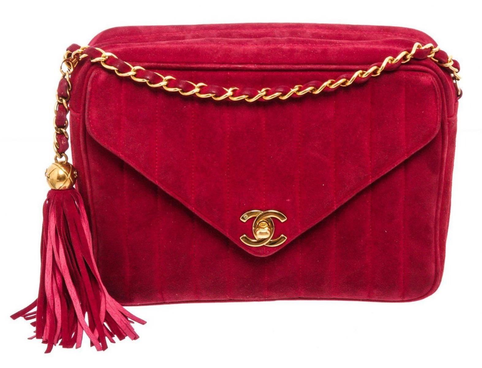 Chanel Red Suede Envelope Tassel Shoulder Bag. Chanel Red Suede Envelope Tassel Shoulder Bag with gold-tone hardware, interior zip pocket, lining suede, chain shoulder strap and snap closure. MEASUREMENTS: Length 8.5 in / 22 cm Width 2.5 in / 6 cm H