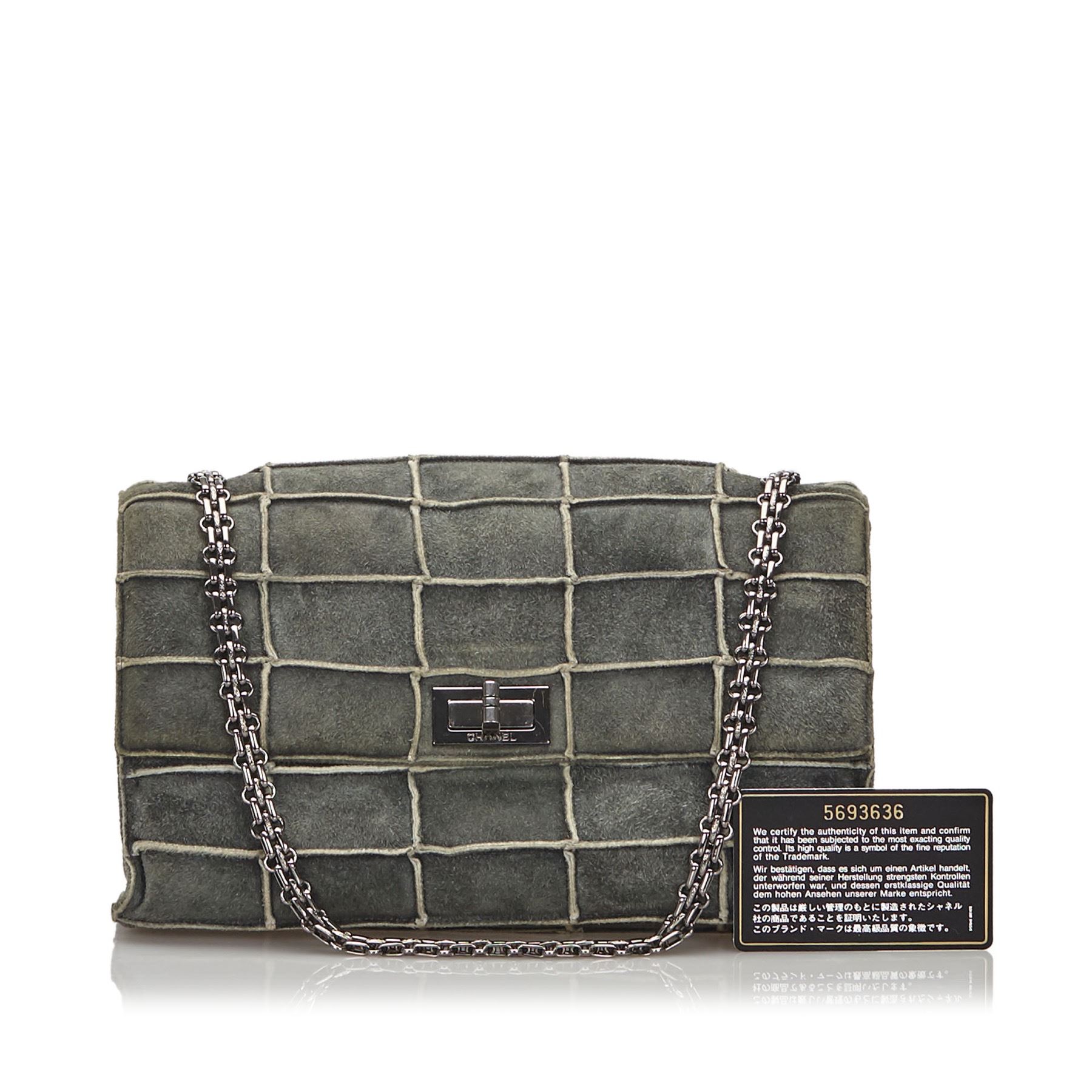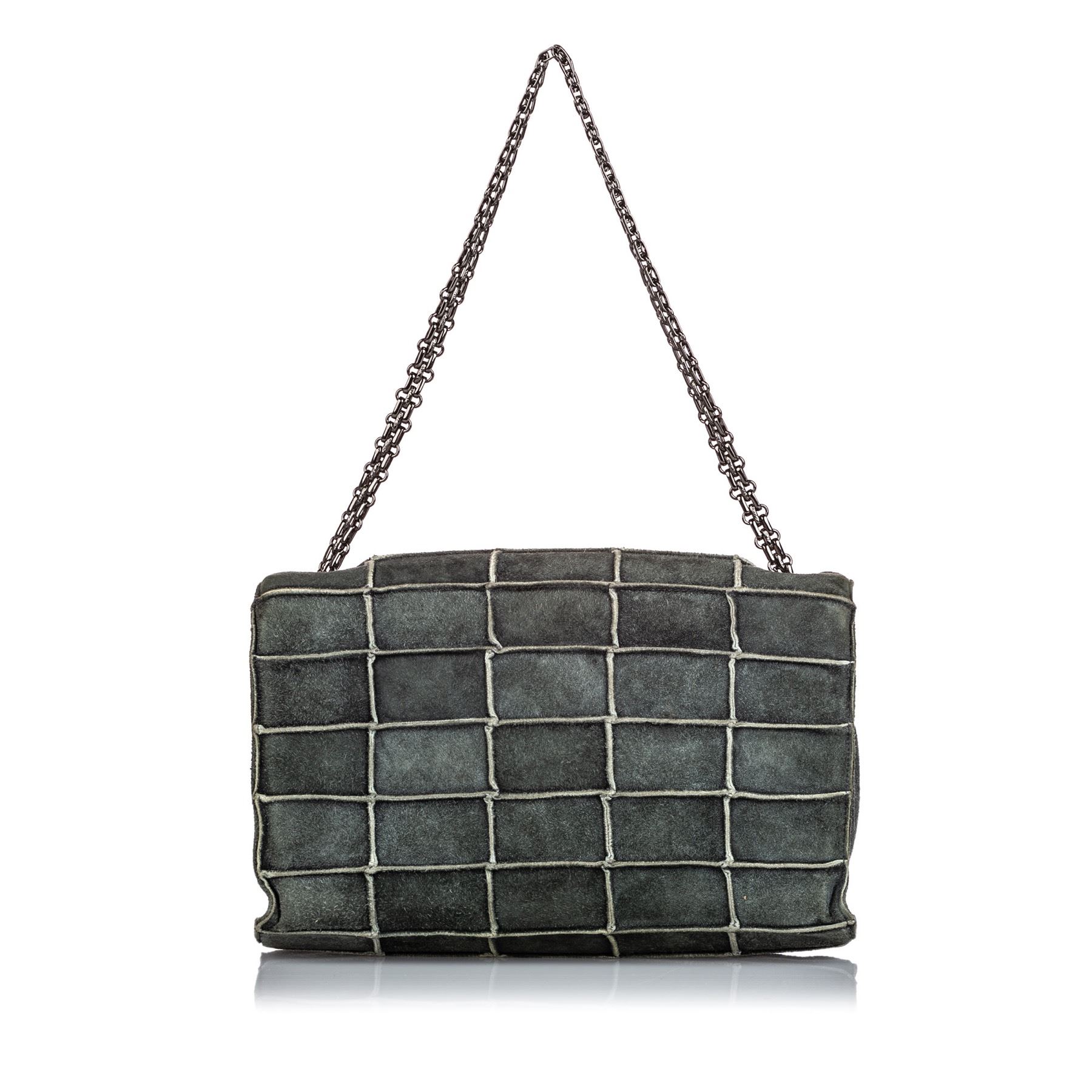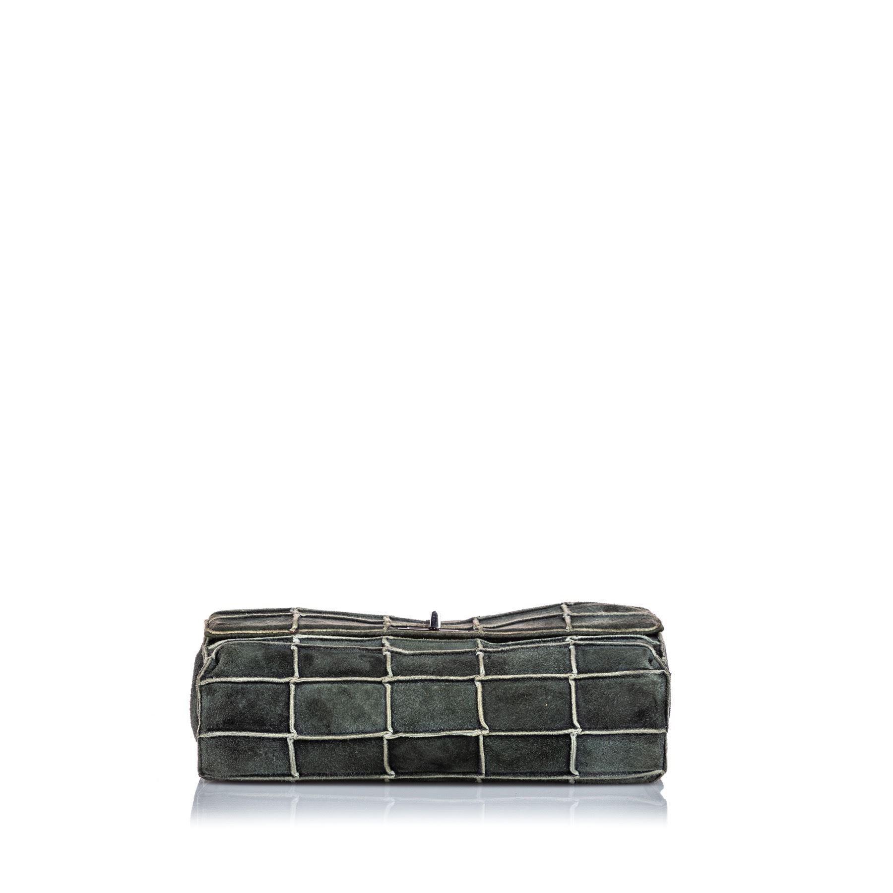 The Reissue Patchwork Flap shoulder bag features a suede patchwork body, a silver-tone chain strap, a front flap with the reissue twist lock closure, and an interior zip pocket. Leather x Suede Gray x Dark Gray Exterior front is stained. Exterior back is stained. Exterior bottom is stained. Size: 17 x 25 x 6 Card: YES Made in: FRANCE