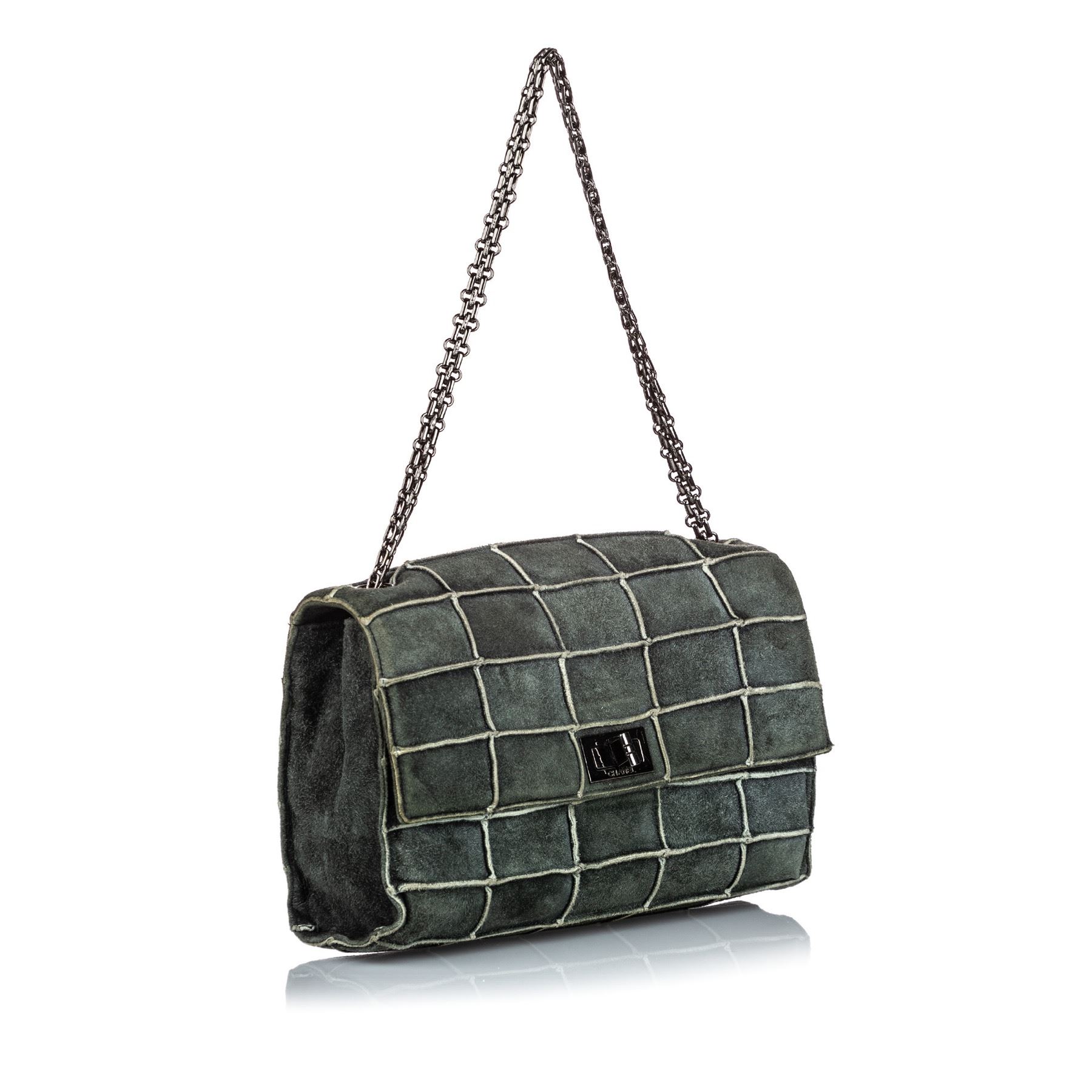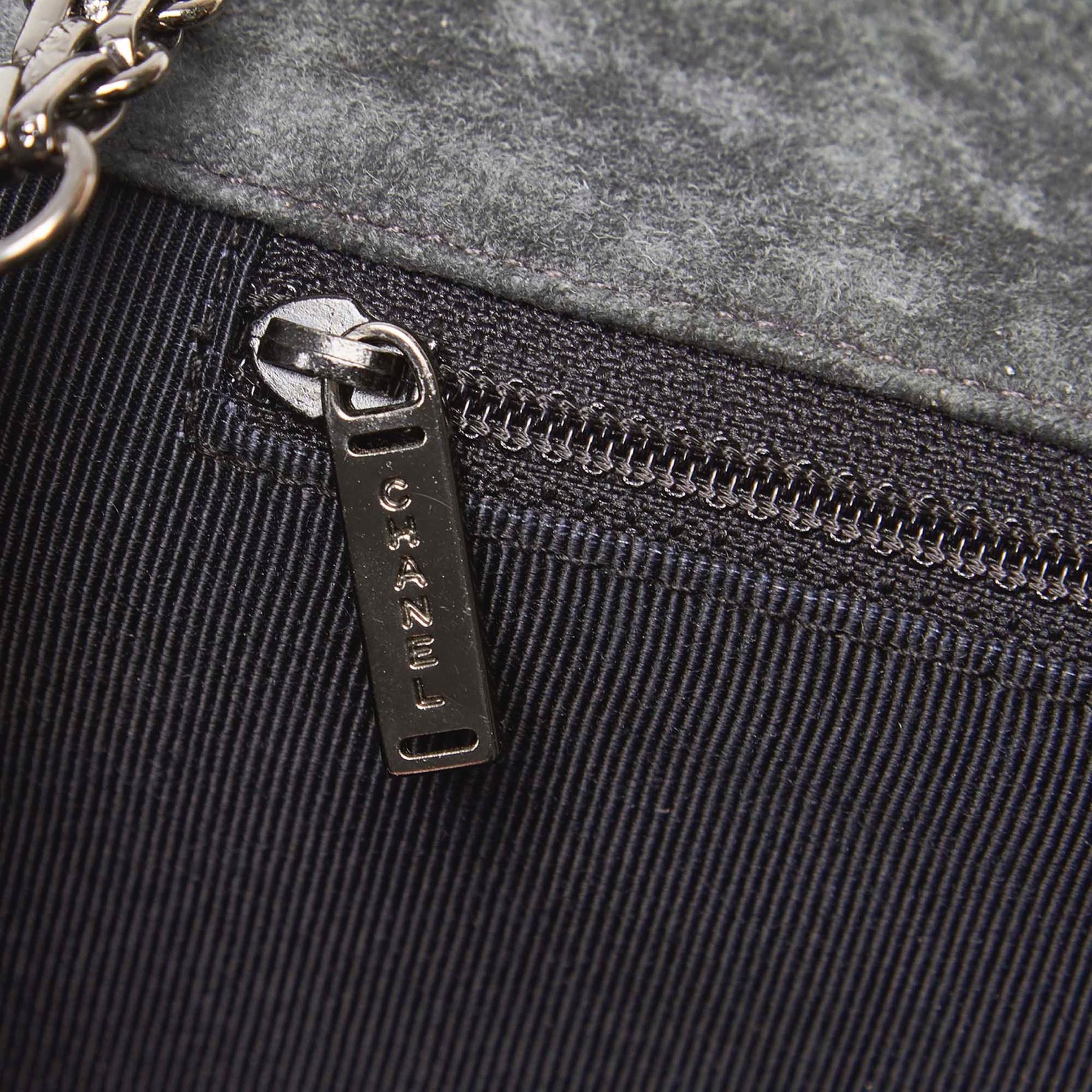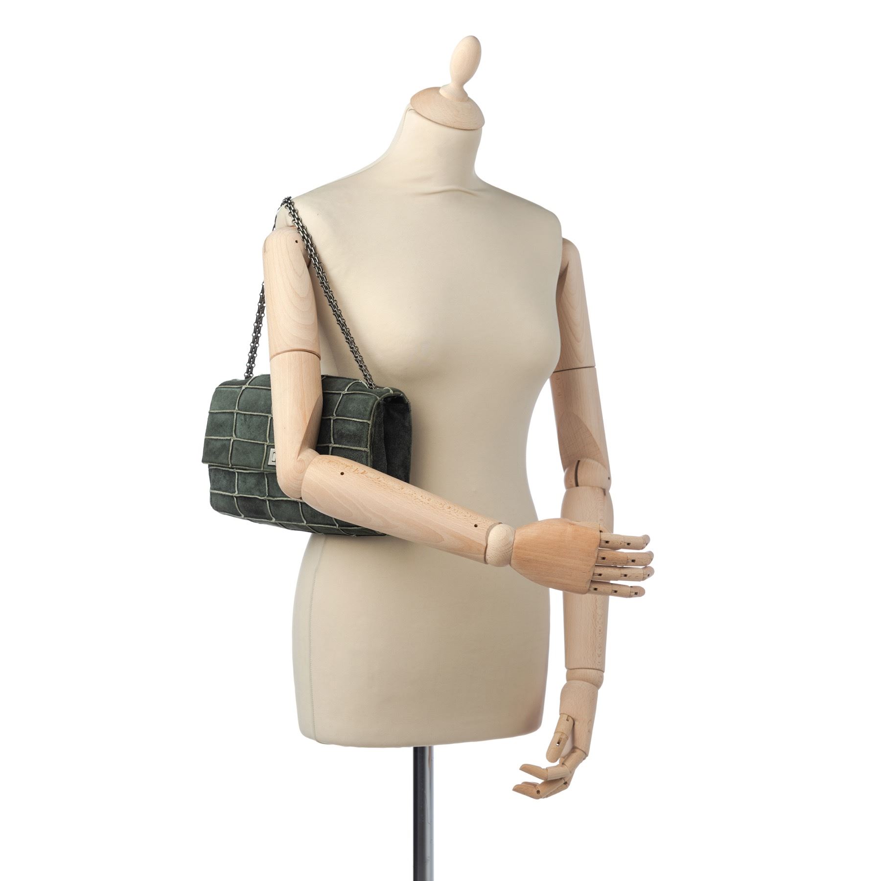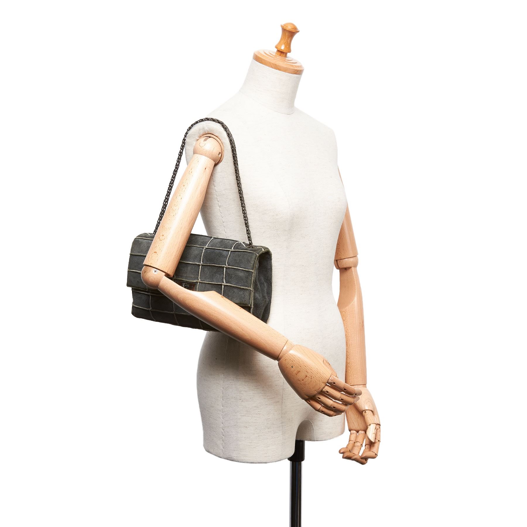 The Reissue Patchwork Flap shoulder bag features a suede patchwork body, a silver-tone chain strap, a front flap with the reissue twist lock closure, and an interior zip pocket. Leather x Suede Gray x Dark Gray Exterior front is stained. Exterior back is stained. Exterior bottom is stained. Size: 17 x 25 x 6 Card: YES Made in: FRANCE