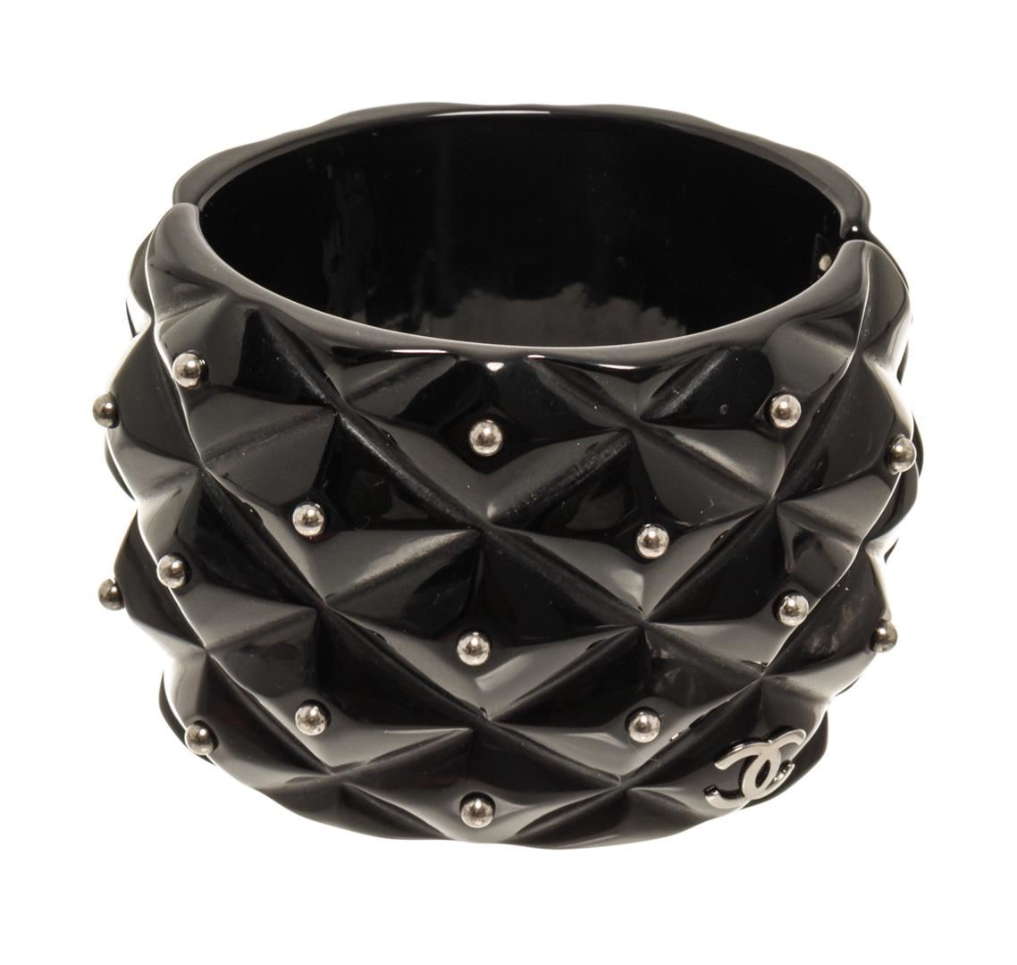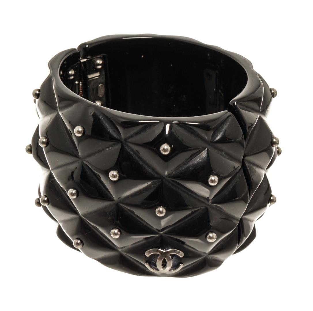 Chanel Resin CC Hinged Bangle. All available information is listed in the description and shown in the photos. Chanel Resin CC Hinged Bangle Inside Circumference 7.5", Width 2.2" / Width : 5.58 Cm