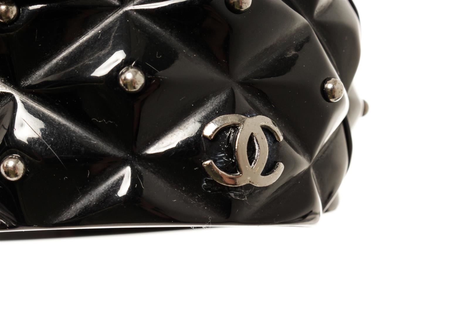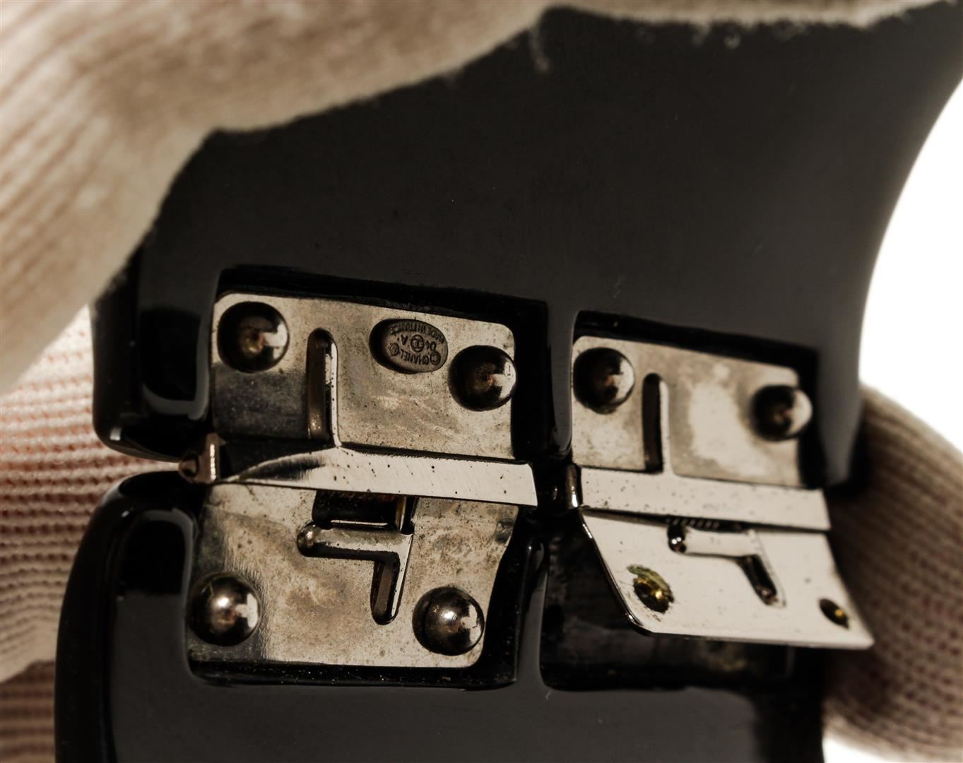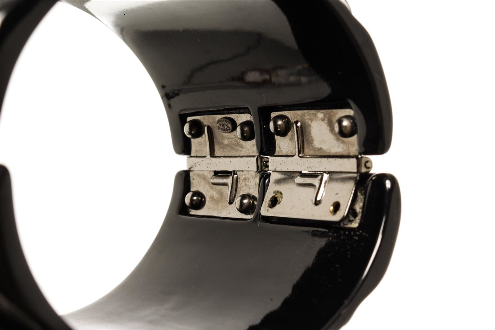 Chanel Resin CC Hinged Bangle. All available information is listed in the description and shown in the photos. Chanel Resin CC Hinged Bangle Inside Circumference 7.5", Width 2.2" / Width : 5.58 Cm