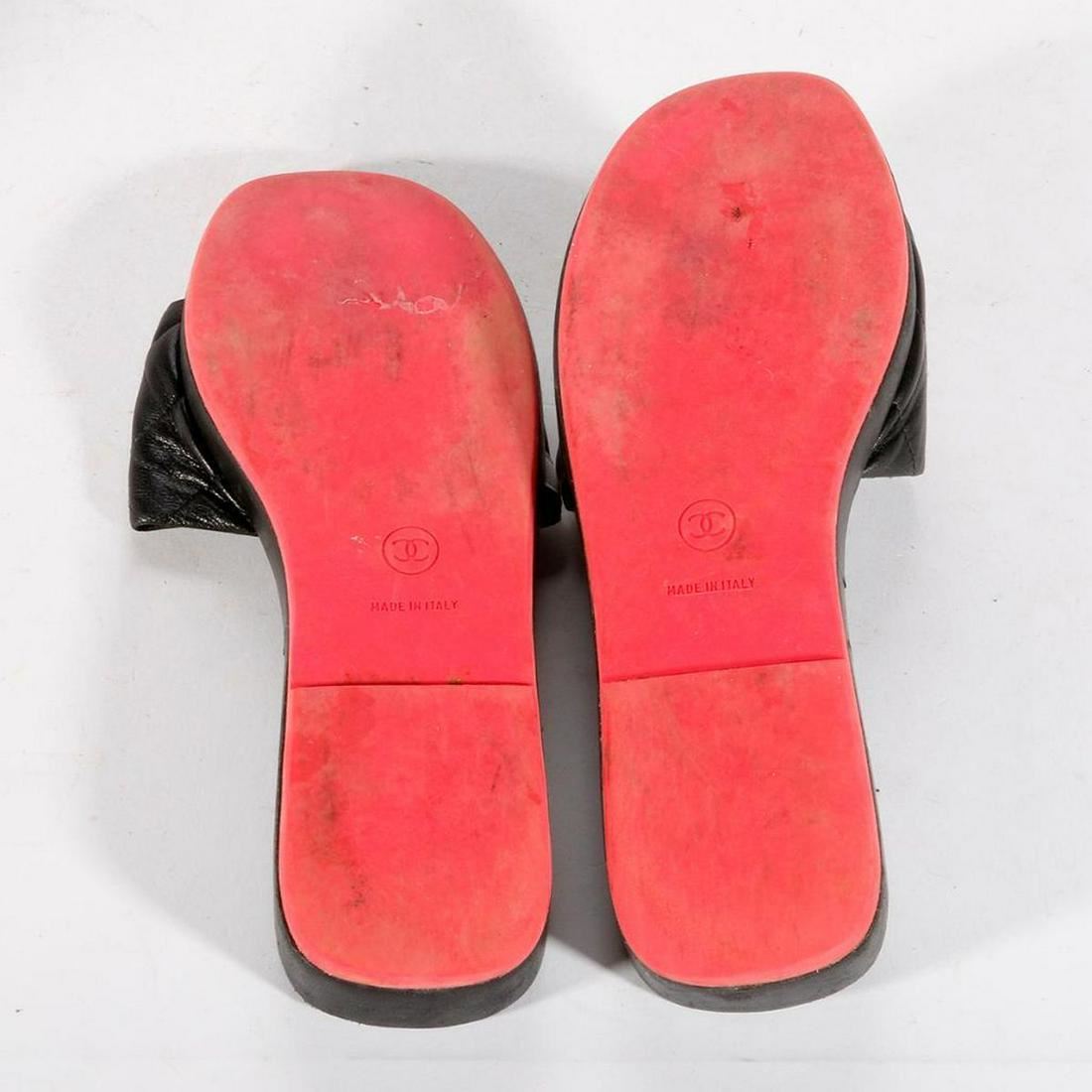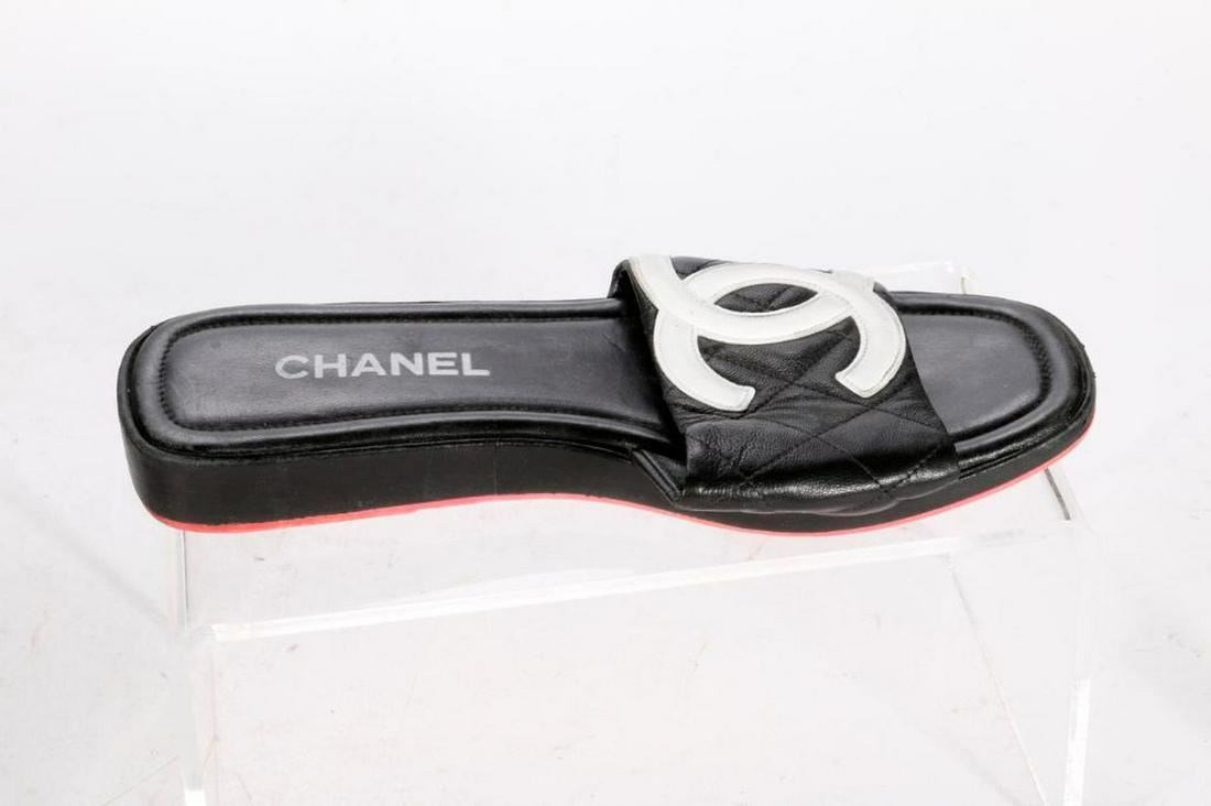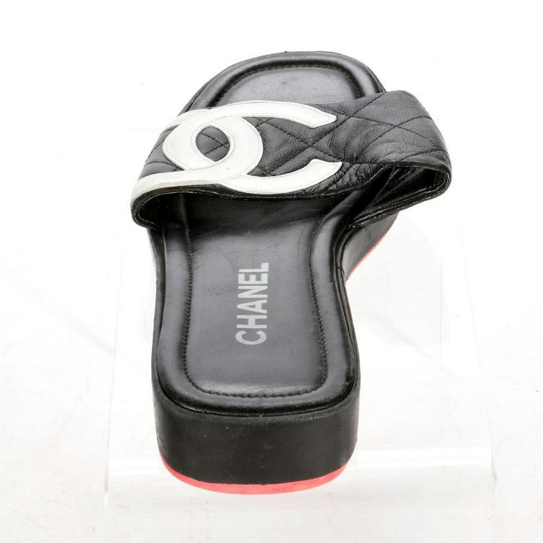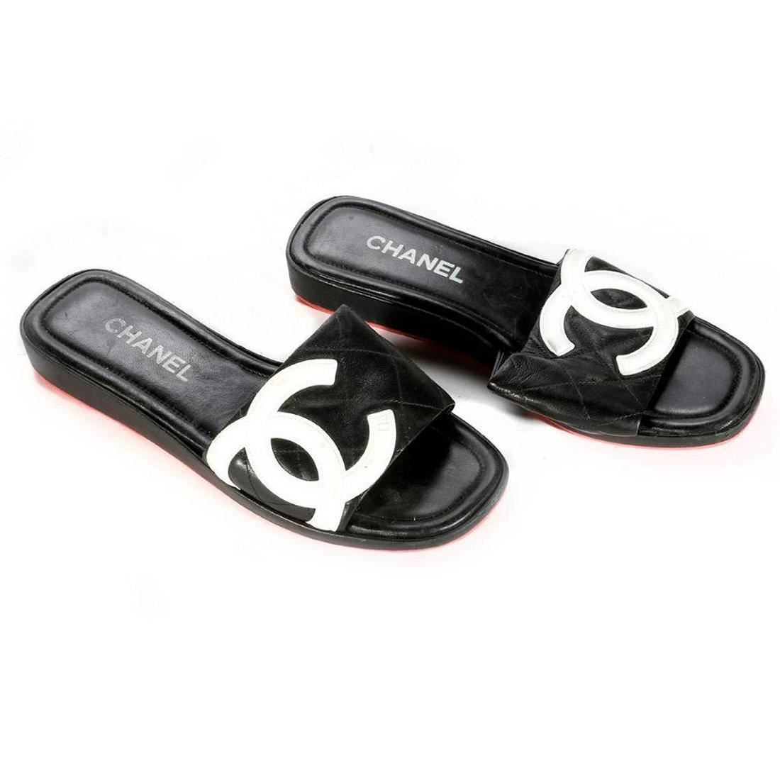 Chanel black leather sandals with white Chanel logo. Size 40. Please note that sandals are worn. Refer to photos. Items are sold as is. Please inquire about condition if not otherwise stated.