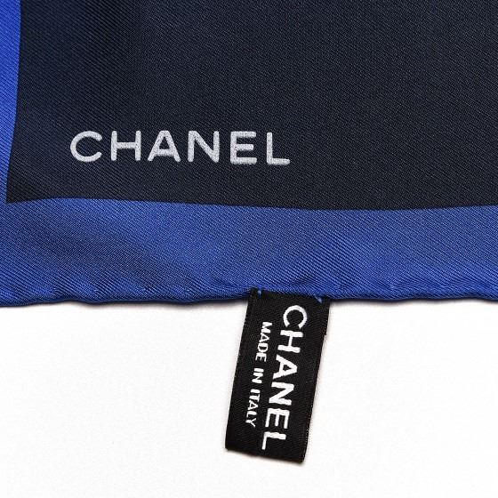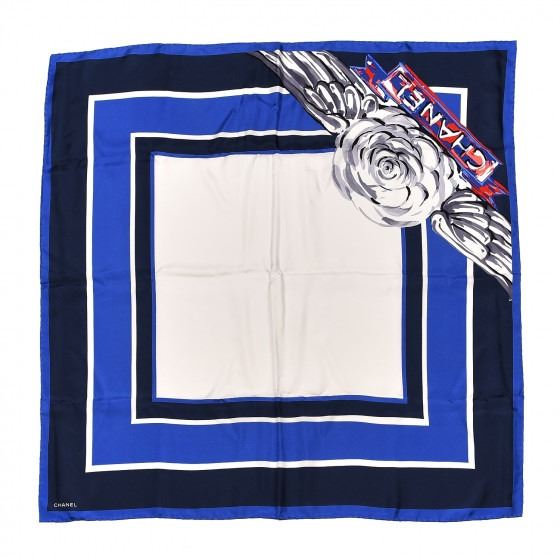 Blue Ivory silk scarf features a camellia flower and Chanel written in white with a blue border. Enjoy this versatile scarf with the timeless style of Chanel!