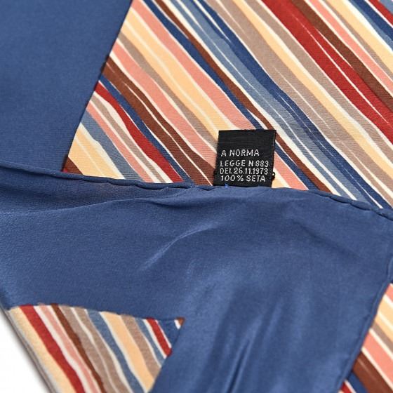 Blue 100% silk scarf and features multicolor stripes and a blue border.