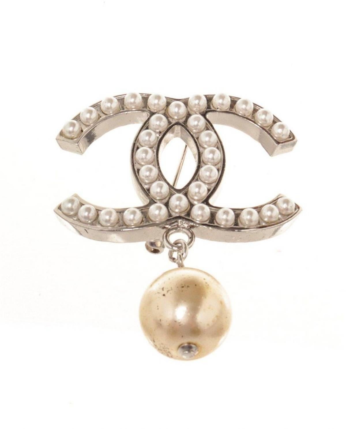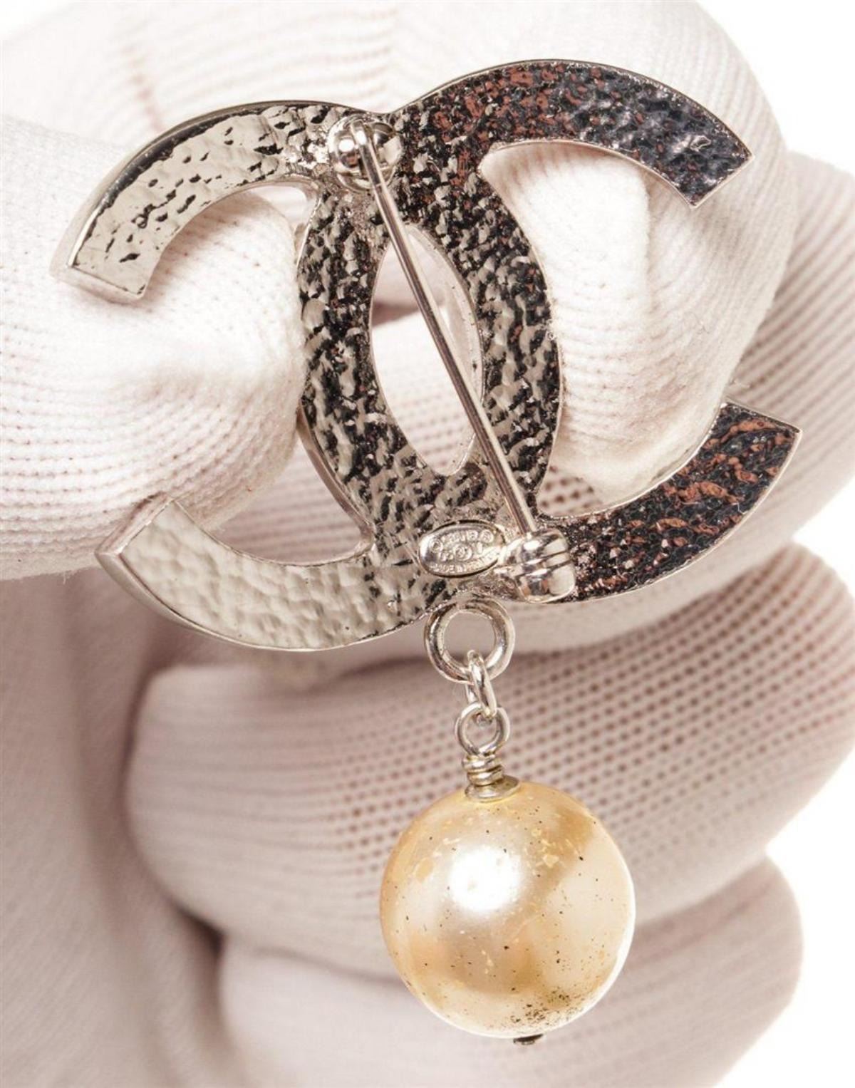 Chanel Silver CC Brooch with crystal rhinestones and bar pin fastening.