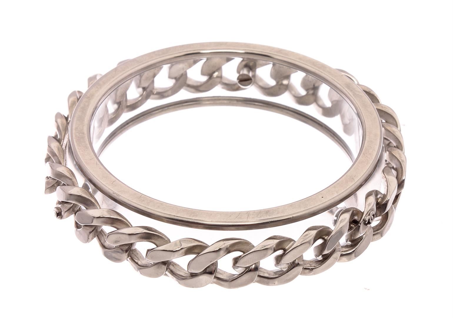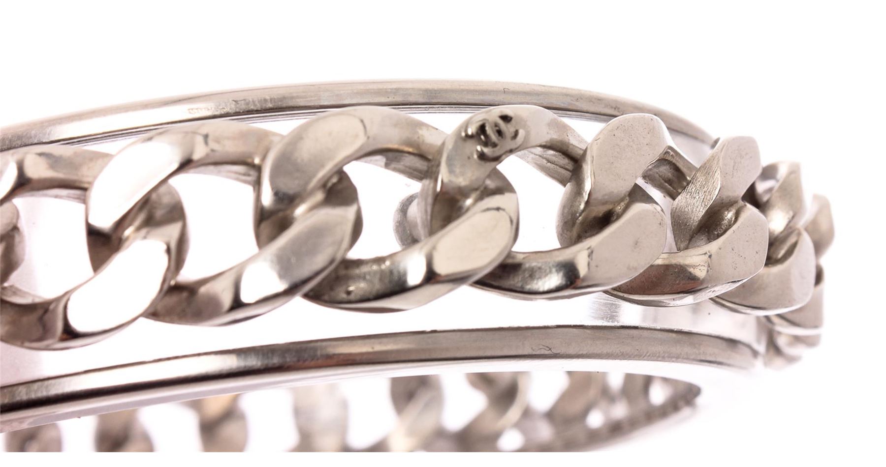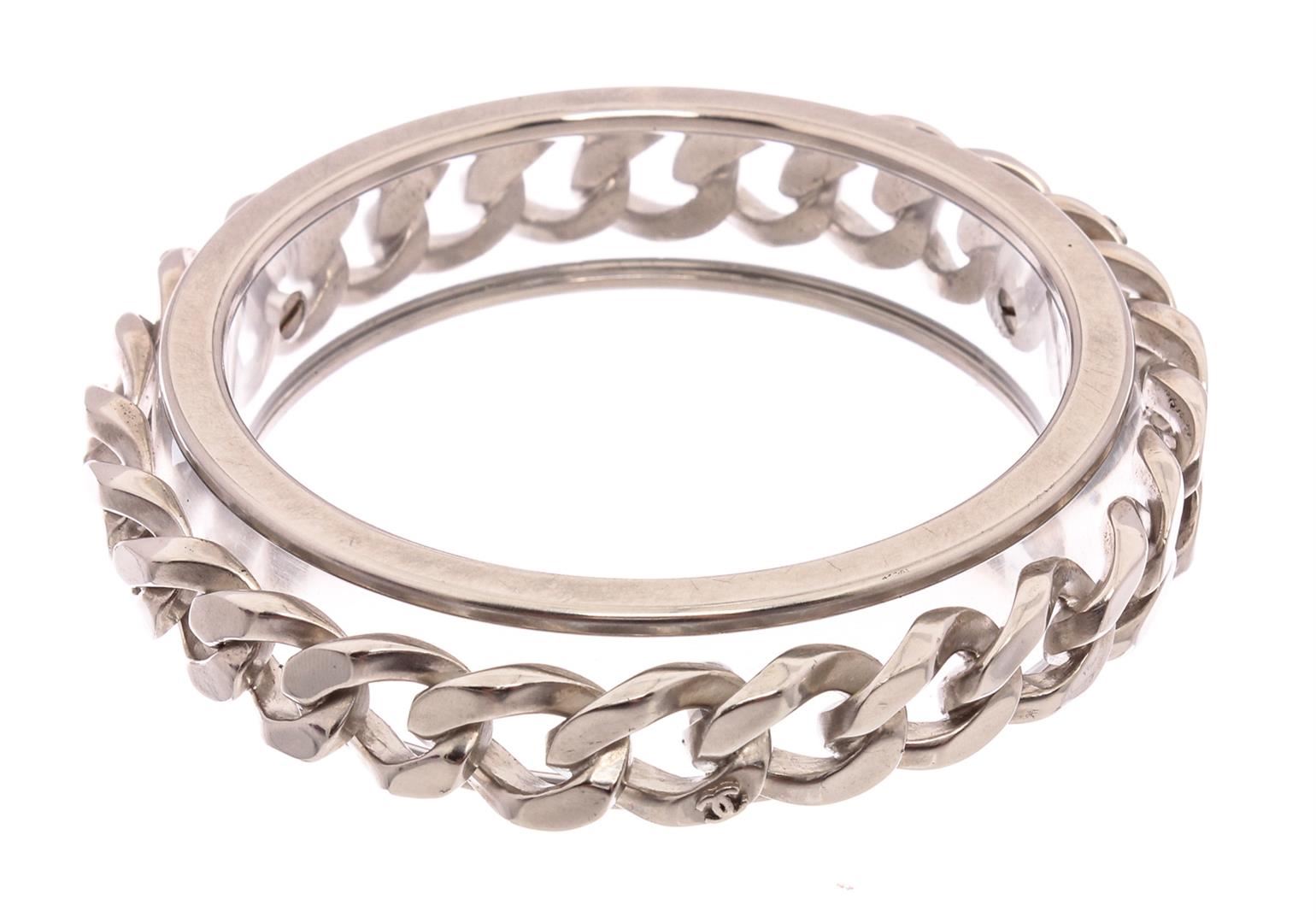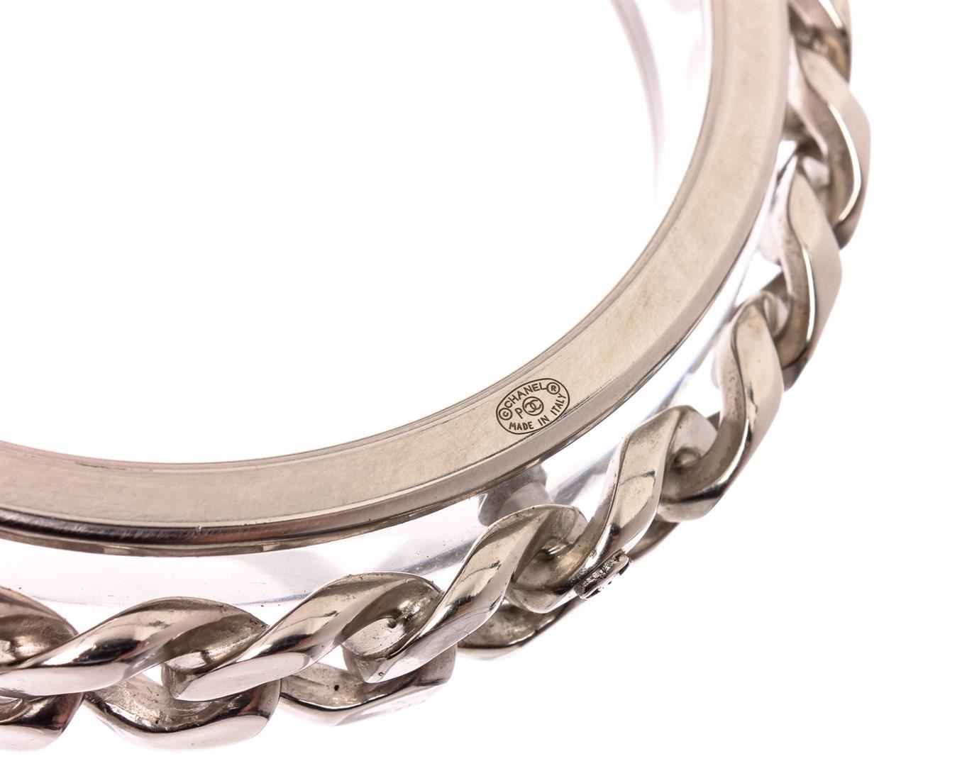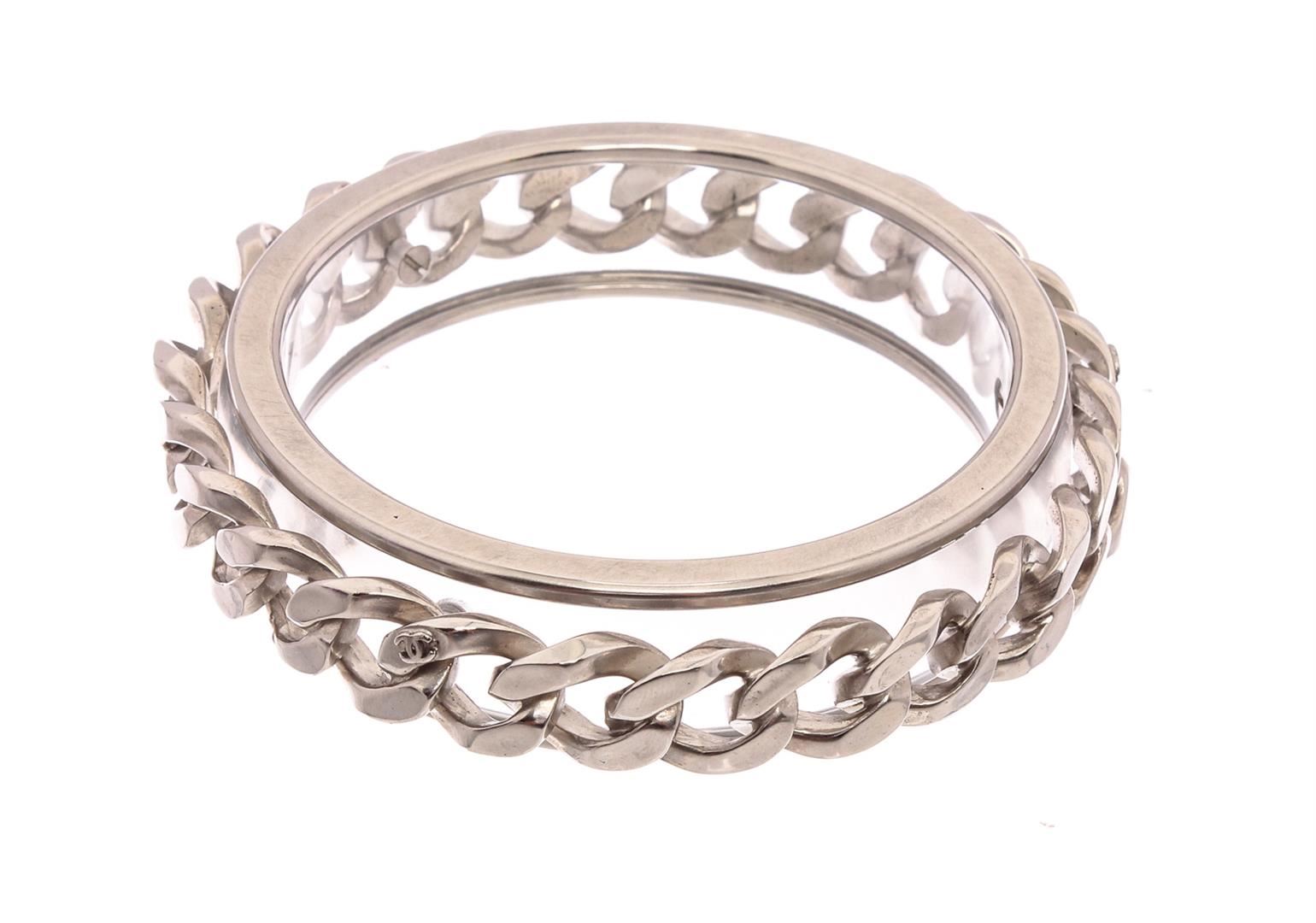 Chanel bangle bracelet crafted of silver-tone chain links with 'CC' logo emblem structured on a clear lucite plastic band with silver edges on top and bottom.