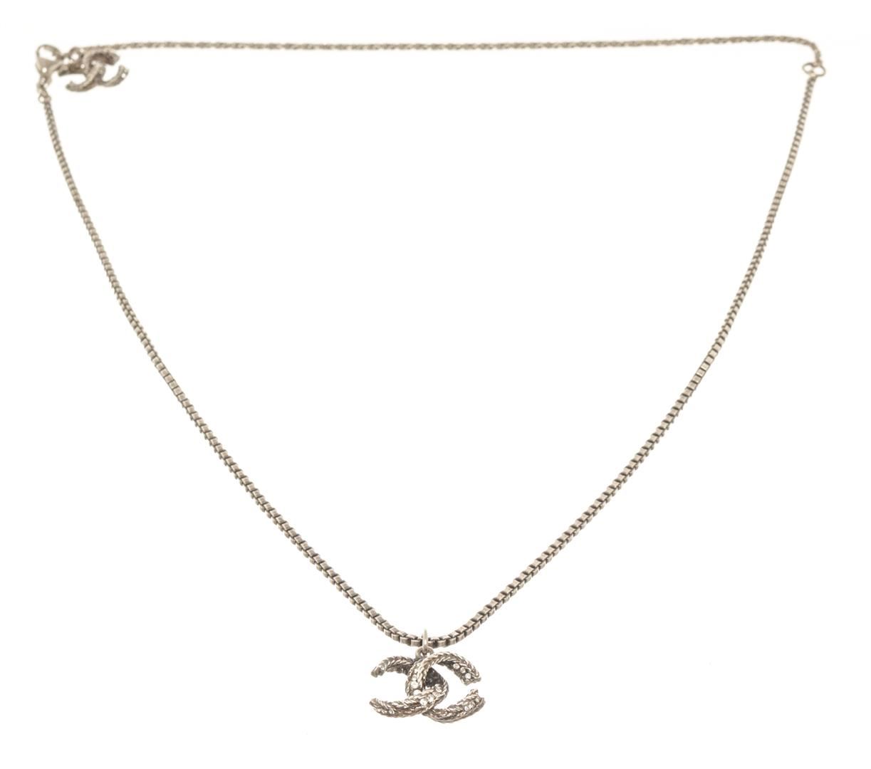 One Chanel Silver CC Chain Necklace. Item is sold AS-IS. All available information is listed in the description and shown in the photo. Chanel silver CC chain necklace features a silver-finished body, lobster claw closure with the Chanel stamp on it, a CC logo with rhinestones on it at the end of the chain, and a CC twist logo pendant with rhinestones on it.