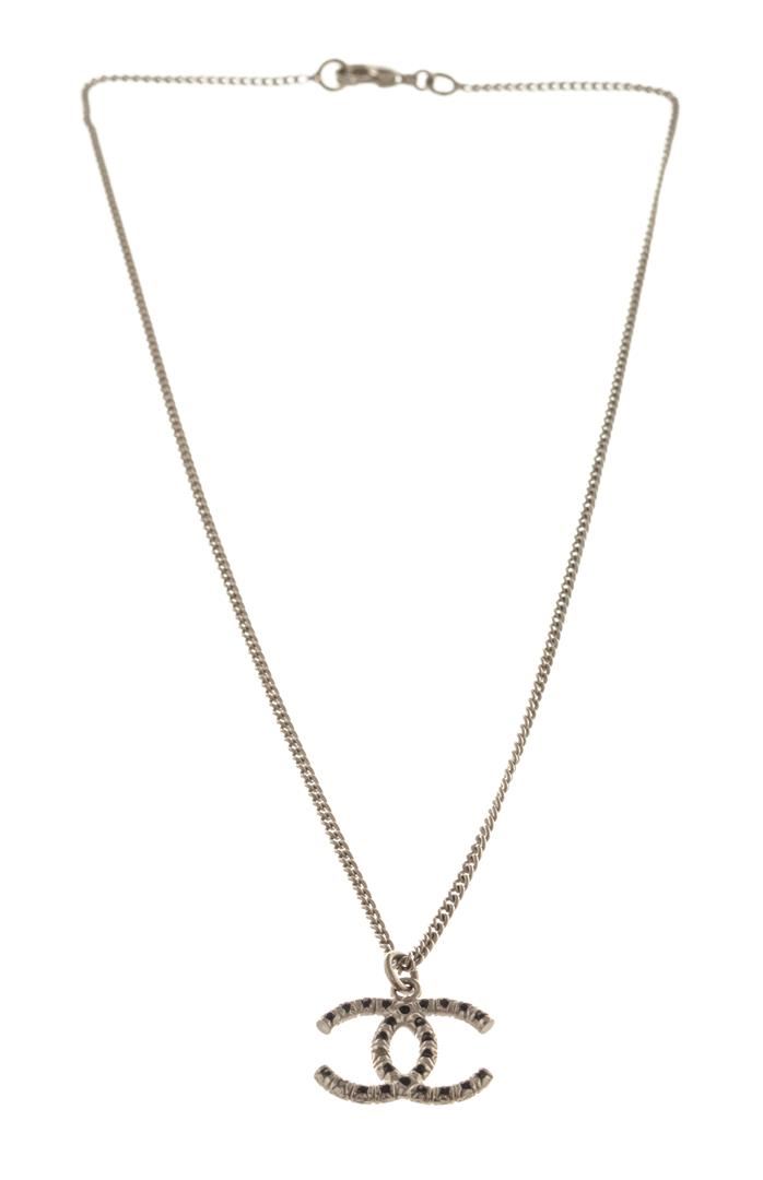 Chanel Silver CC Logo Rhinestone Necklace. All available information is listed in the description and shown in the photos. Chanel Silver CC Logo Rhinestone Necklace with silver tone metal hardware and link, black rhinestones, and lobster claw clasp.