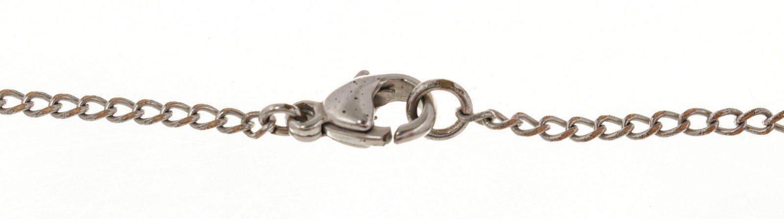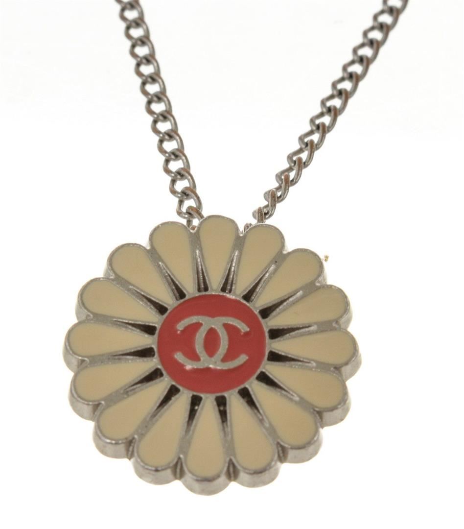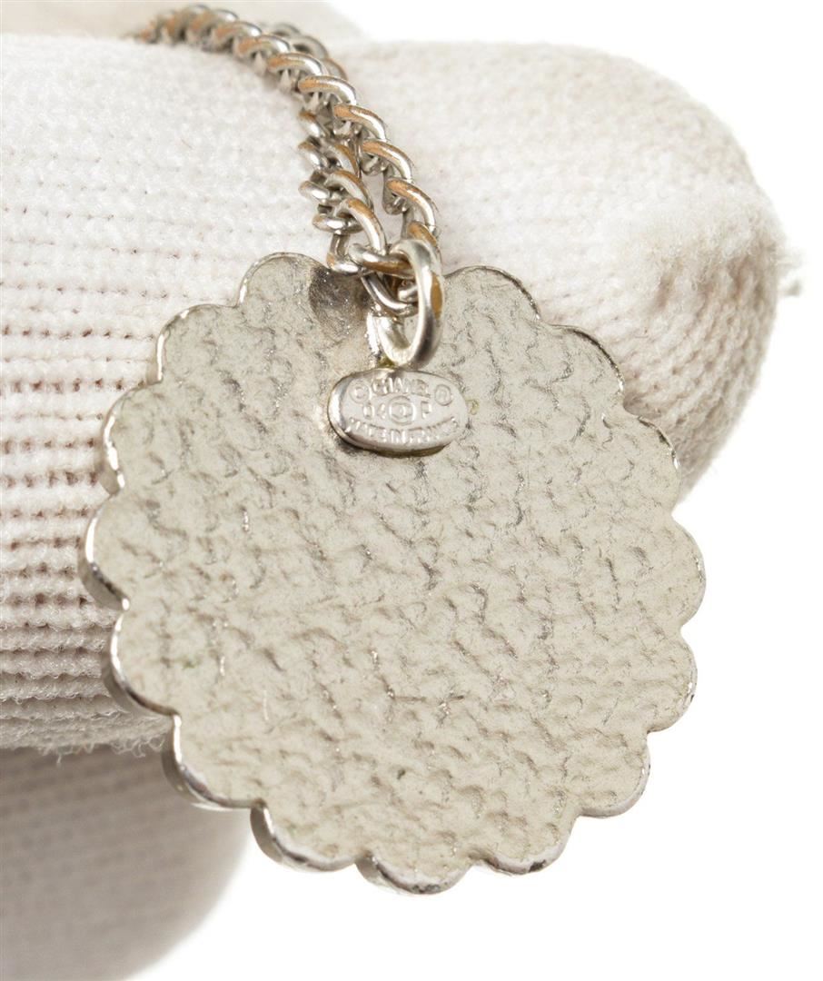 Chanel Silver Camelia CC Necklace with silver tone hardware.