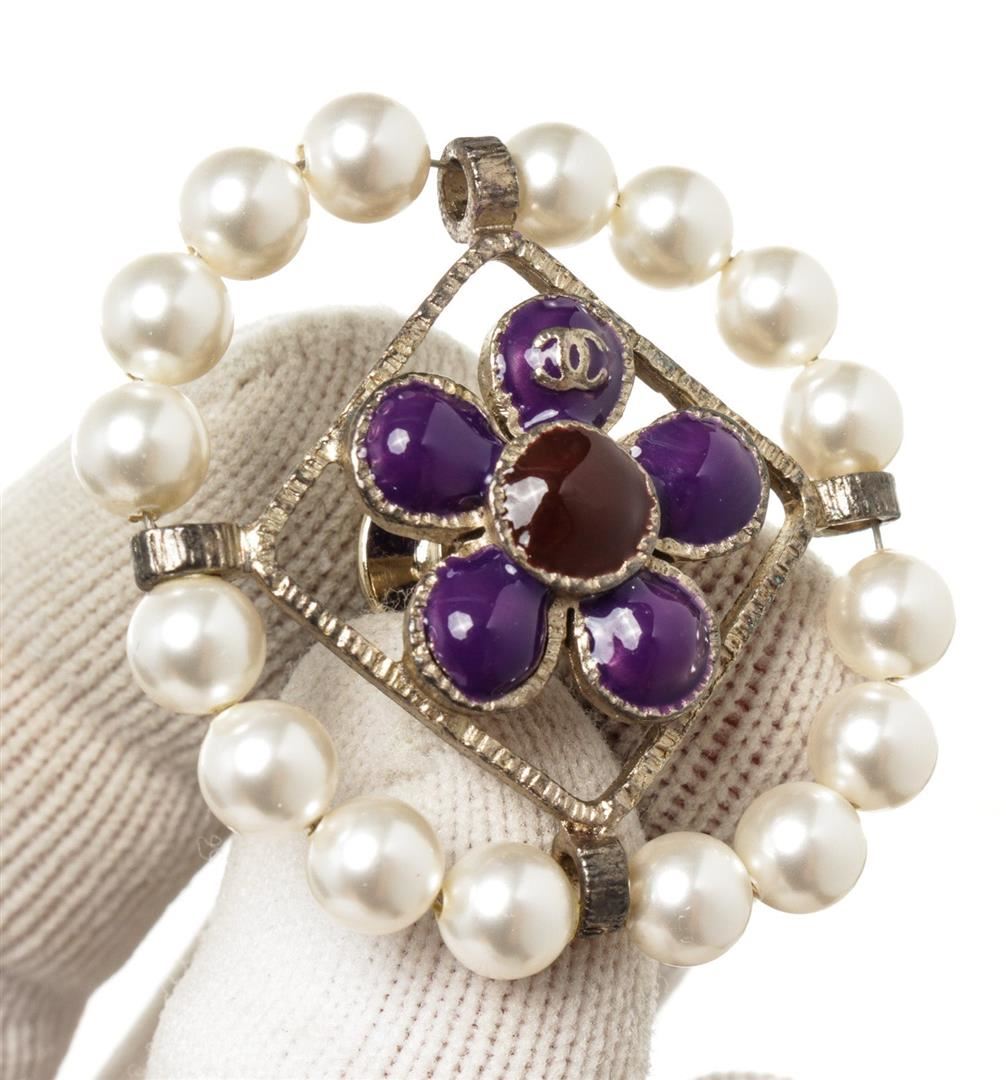 Chanel Silver Camelia Pearl Brooch with a pin back closure.