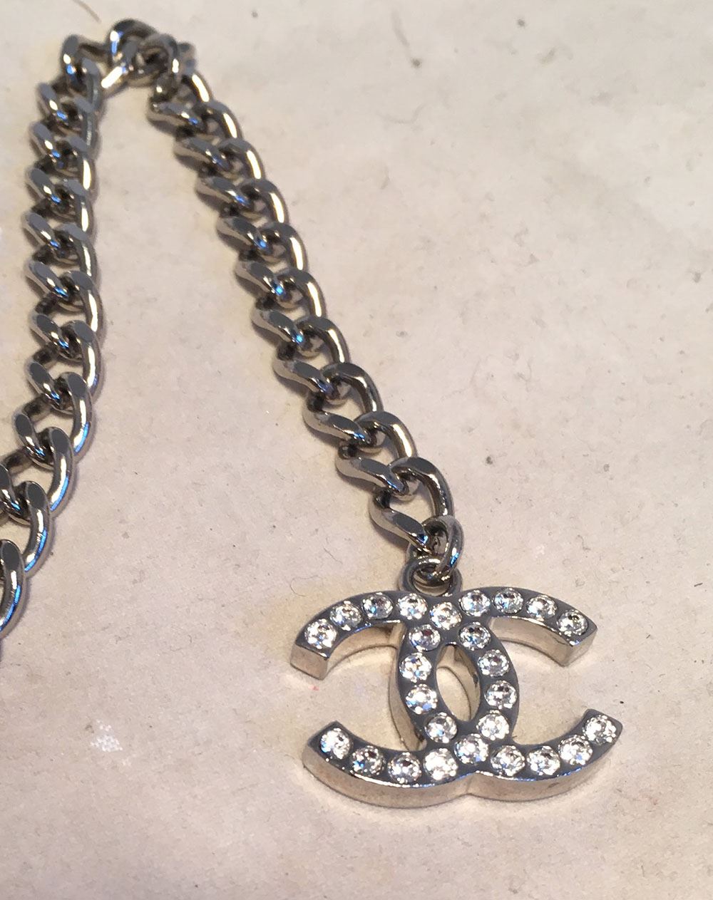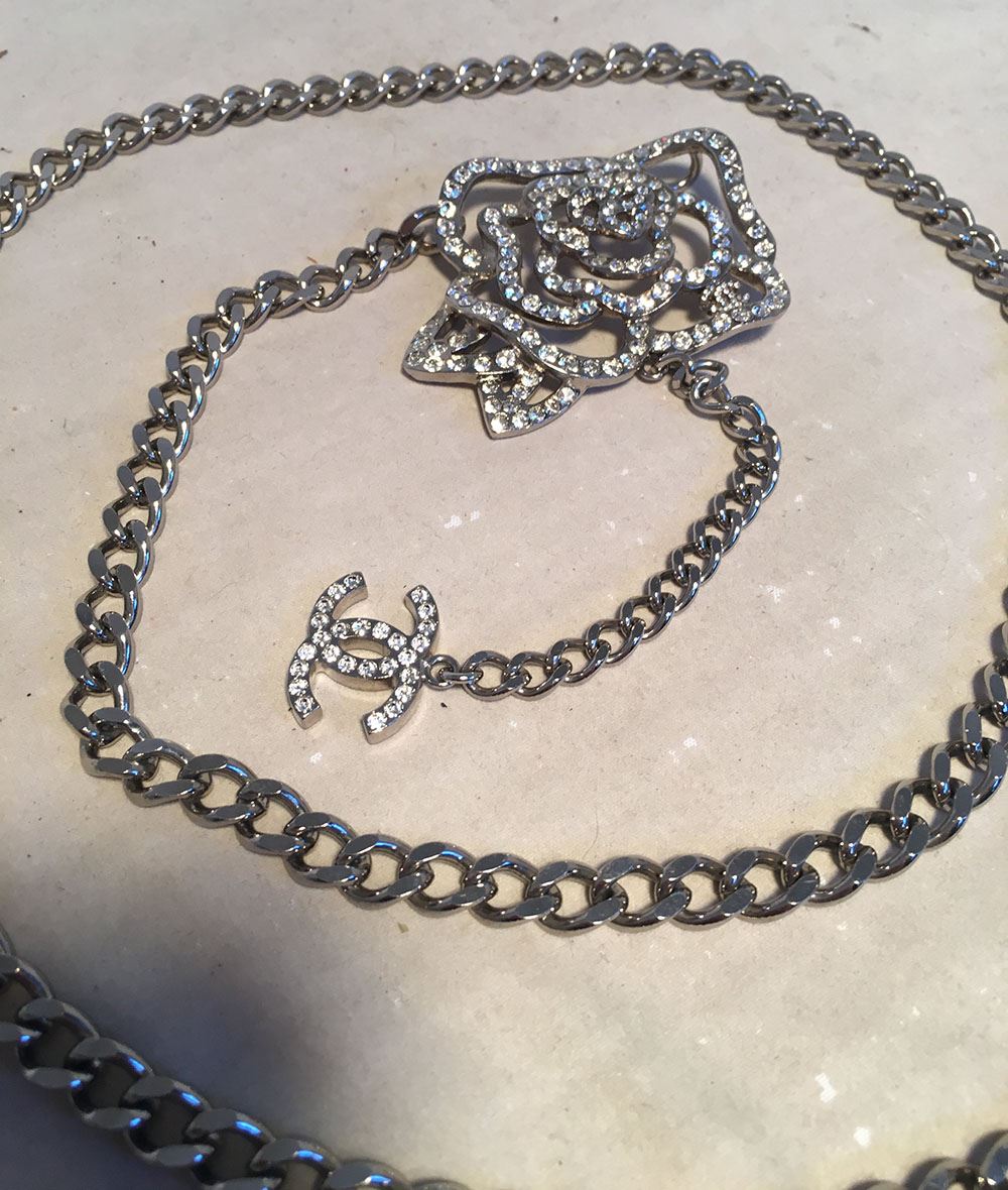 GORGEOUS Chanel Silver Chain Rhinestone Camellia Flower Belt Necklace in excellent condition. Silver link chain with rhinestone embellished Camellia flower detail and CC logo rhinestone charms at both ends of chain. Can be worn as a belt or necklace to suit a variety of styles and preferences. As a necklace it can be worn singled and long or wrapped to create layers and various lengths. No scratches, scuffs, or missing rhinestones. A wonderful piece for Chanel lovers and jewelry collectors alike. Camellia measures: 2.5"x2.25" Chain length hook to loop=33.5" / end to end=40"#Bags1177