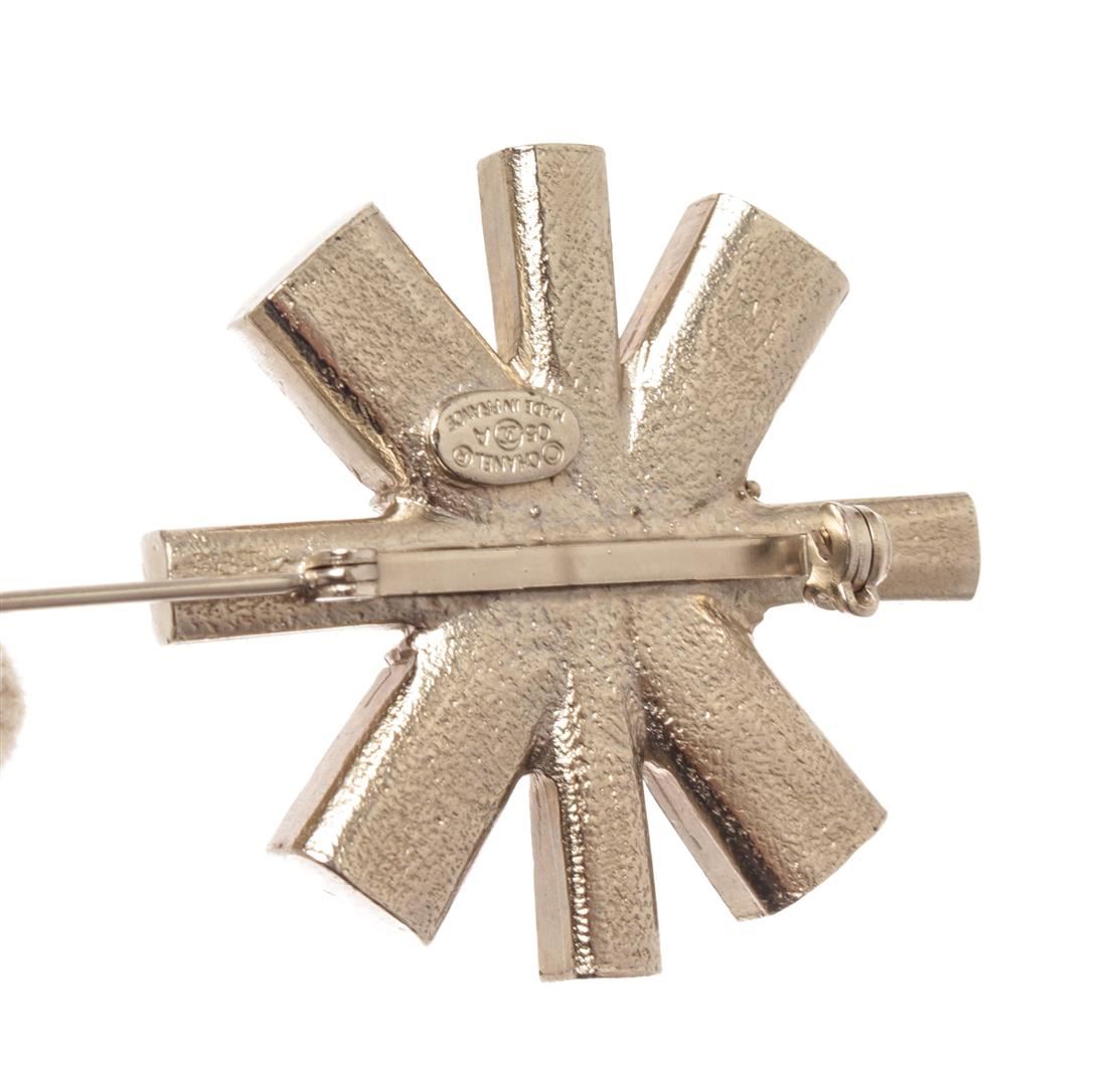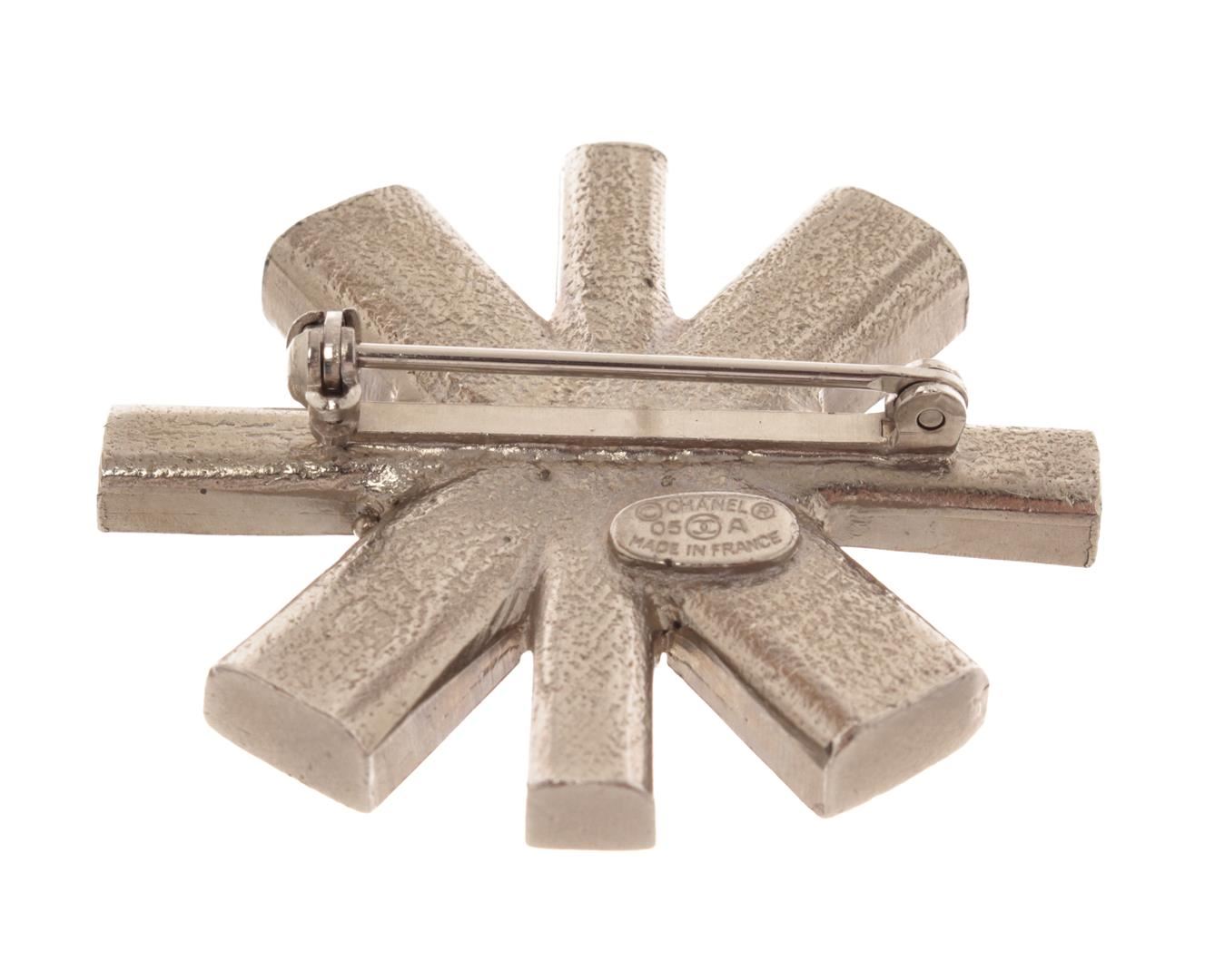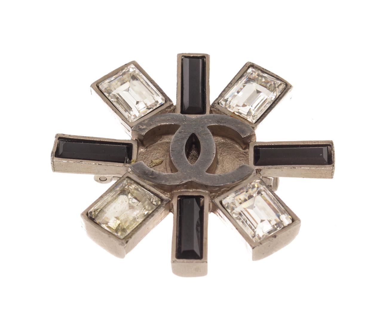Chanel Silver Metal Logo CC Strass Brooch. All available information is listed in the description and shown in the photos. Chanel Silver Metal Logo CC Strass Brooch with silver-tone hardware, cc logo in the middle, cross shape, pin closure on back. L: 36 x W: 39 x H: 9 mm, 1.41 x 1.53 x 0.35 Inches