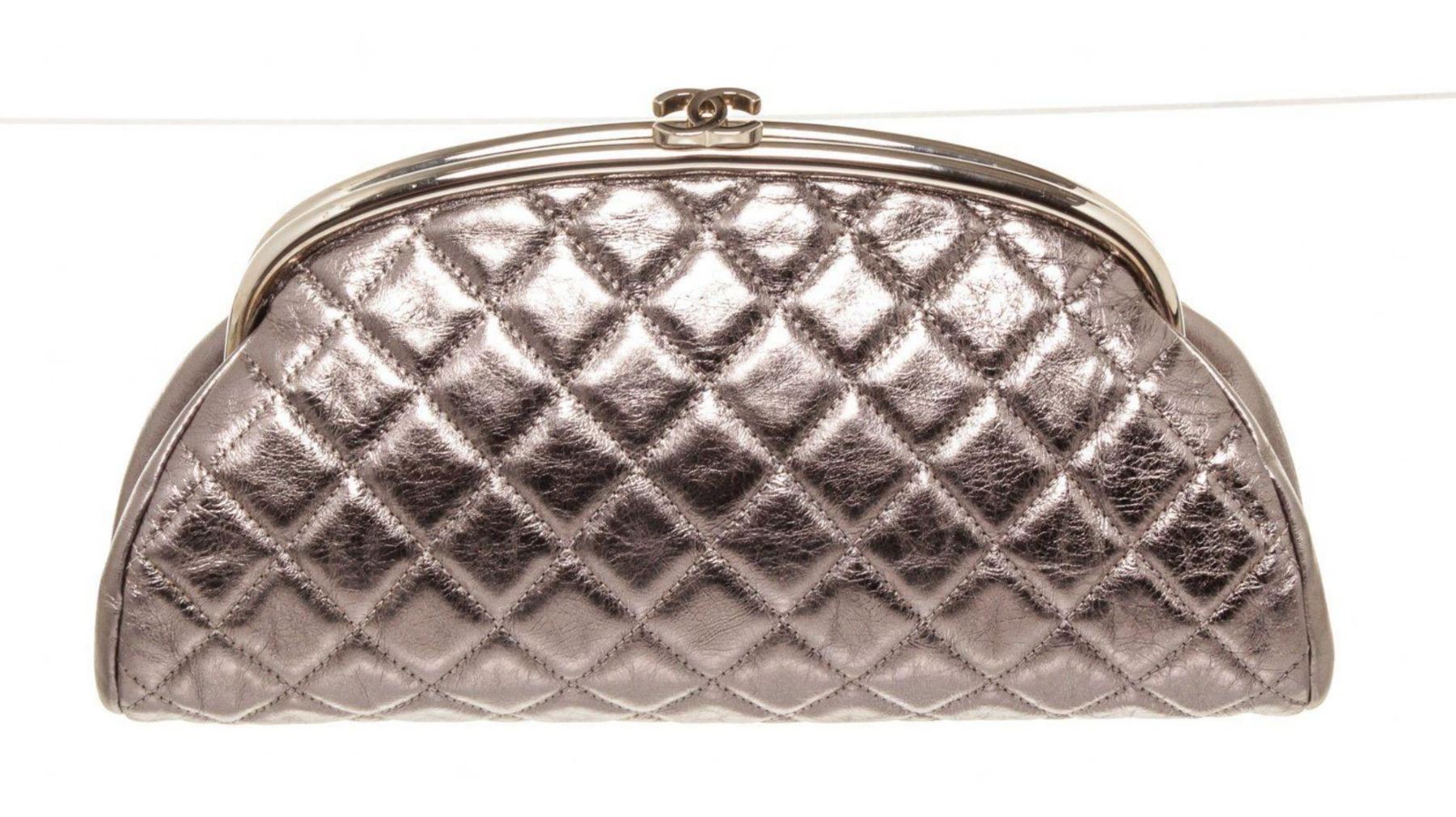 Chanel Silver Patent Timeless Clutch. Chanel Silver Patent Timeless Clutch with material patent leather, silver-tone hardware, interior zip pocket and push-lock closure .
