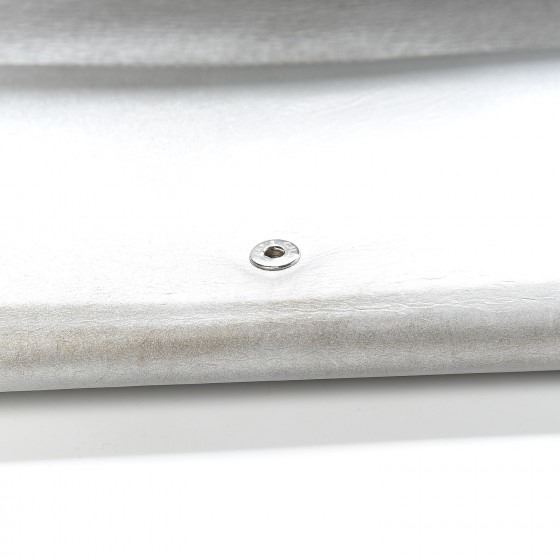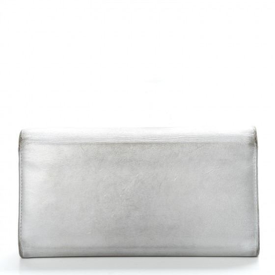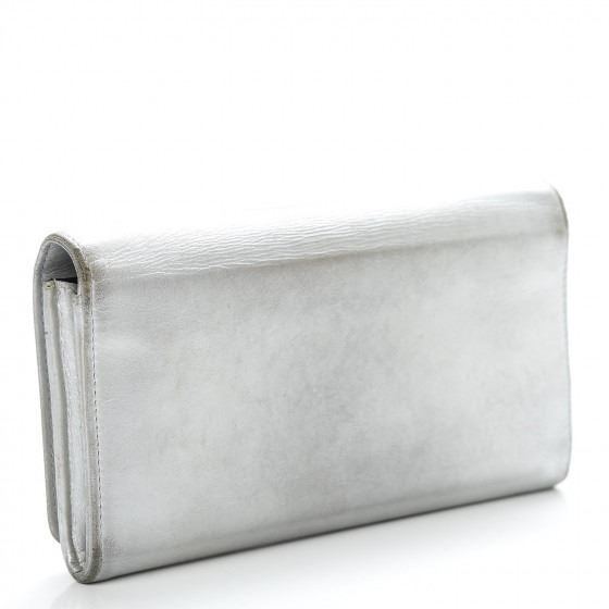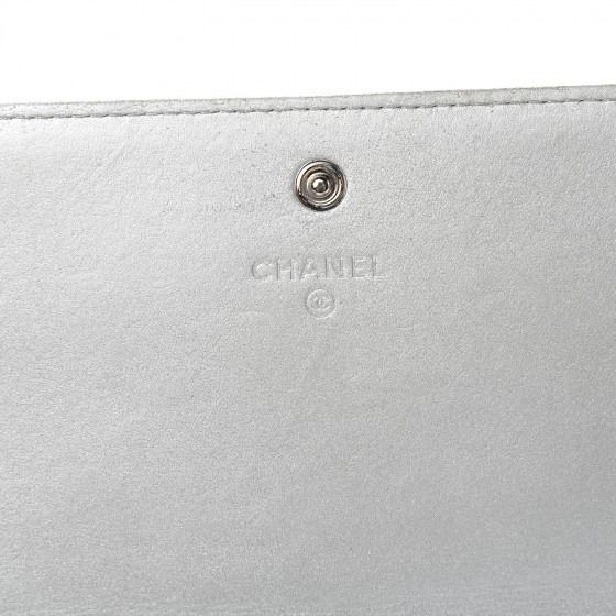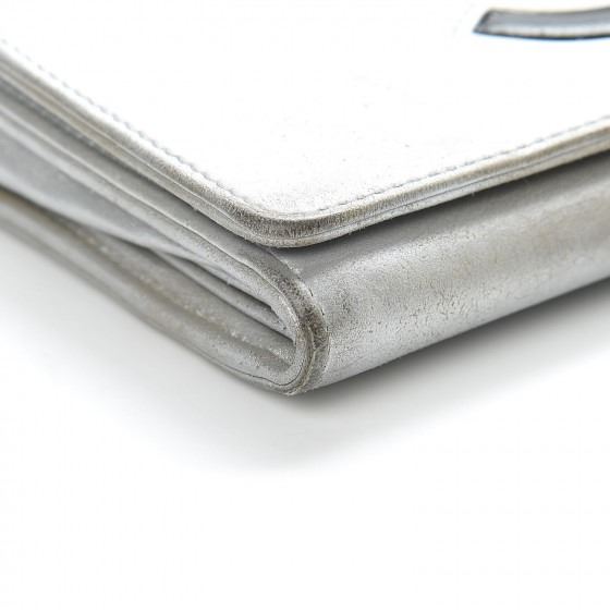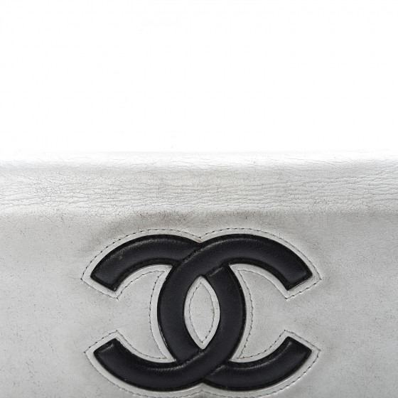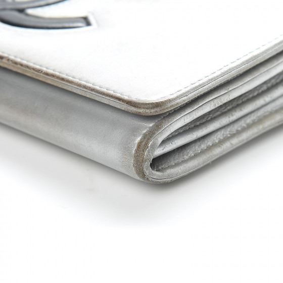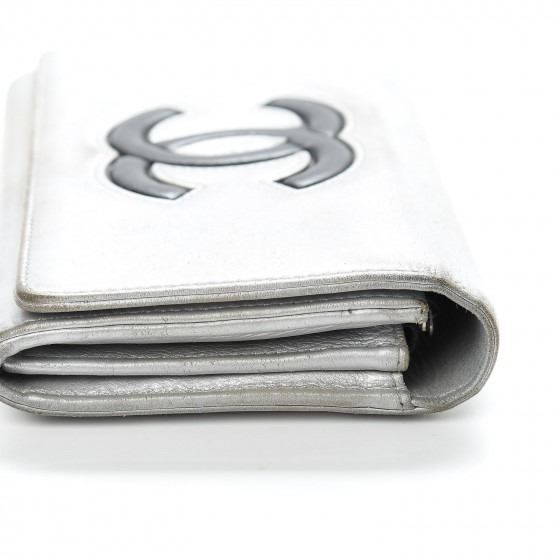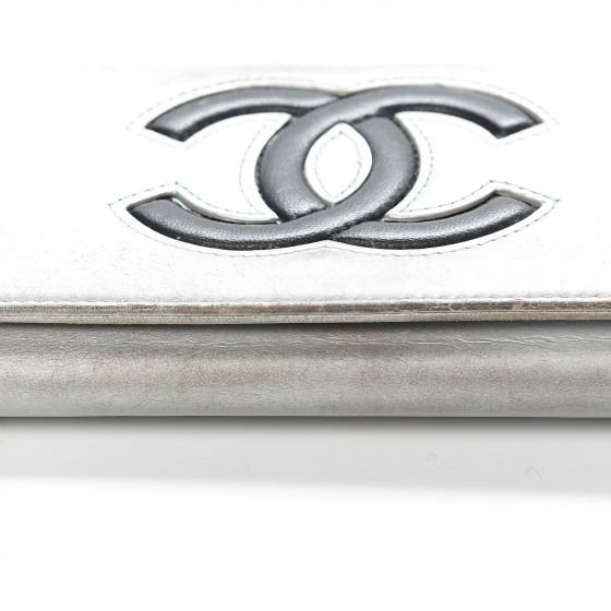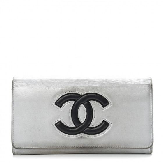 Silver clutch wallet is crafted of smooth lambskin leather in silver with a black quilted CC logo. It opens to a black leather interior with card slots, billfold and a coin compartment.