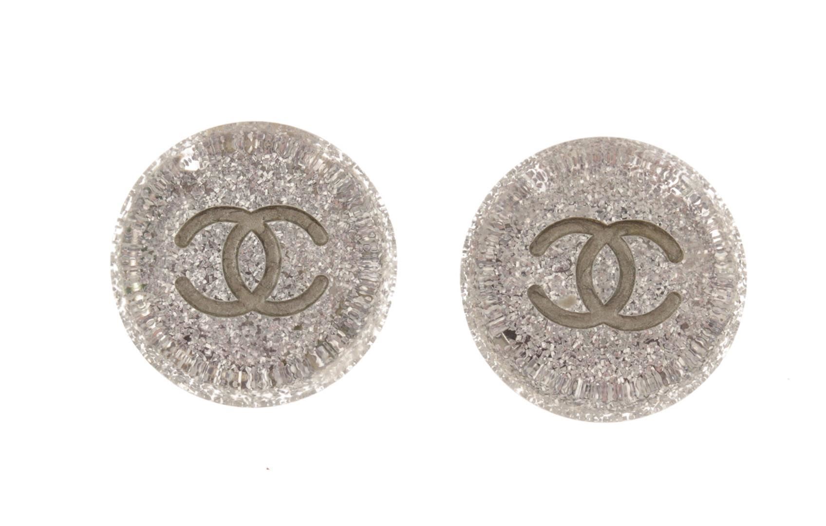 One Chanel Silver-tone Crystal Resin CC Round Clip-on Earrings. Item is sold AS-IS. Please check photos and descriptions for all available details. Chanel Crystal Resin CC Round Clip-on Earrings features CC logo at the centre, made of crystal resin and silver-tone hardware.