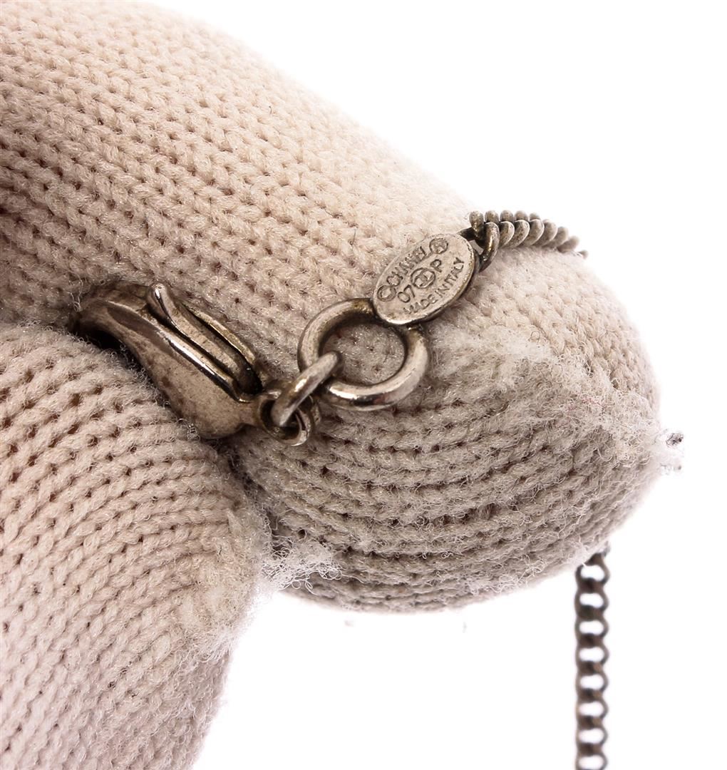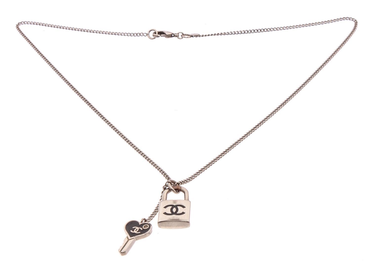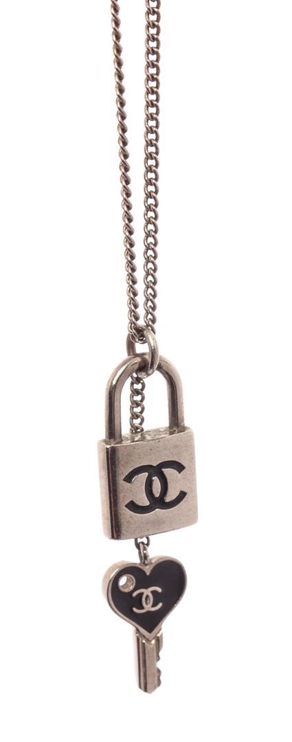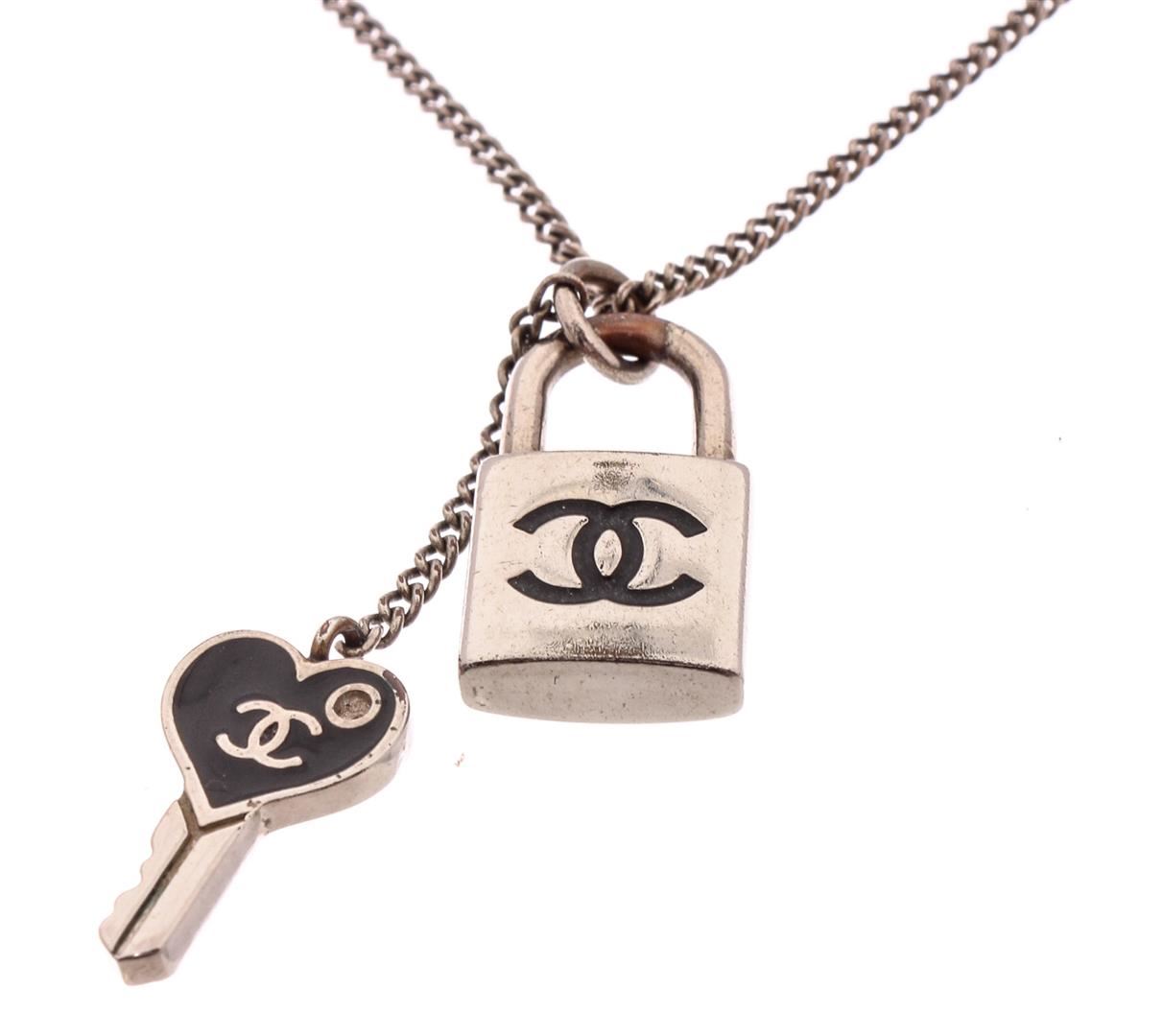 Chanel Lock & Key necklace featuring a padlock with a black CC-embossed logo, heart shaped key and lobster-claw closure.