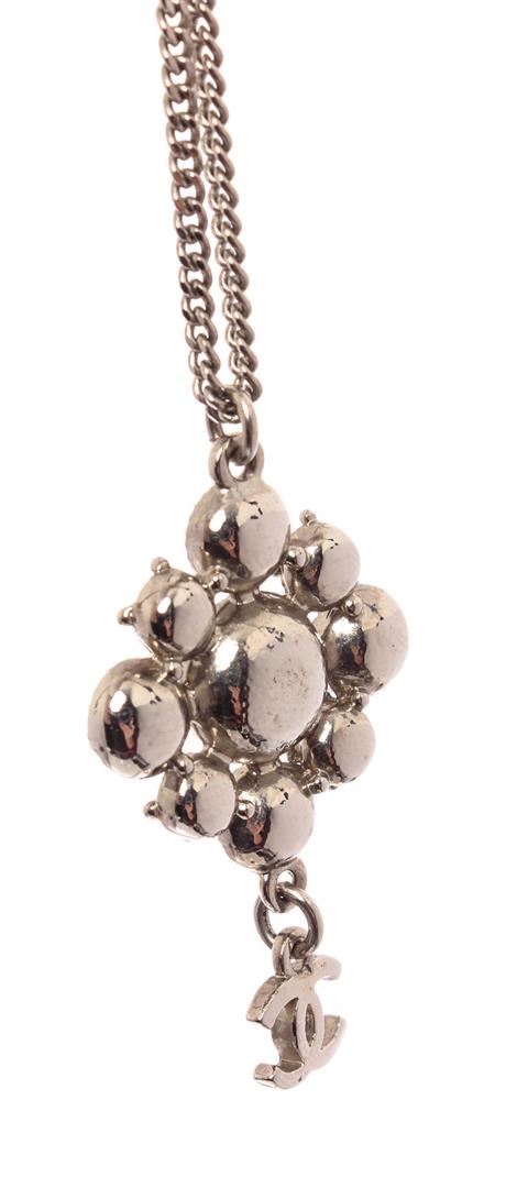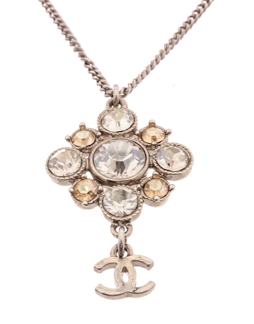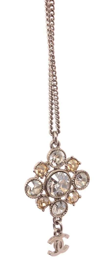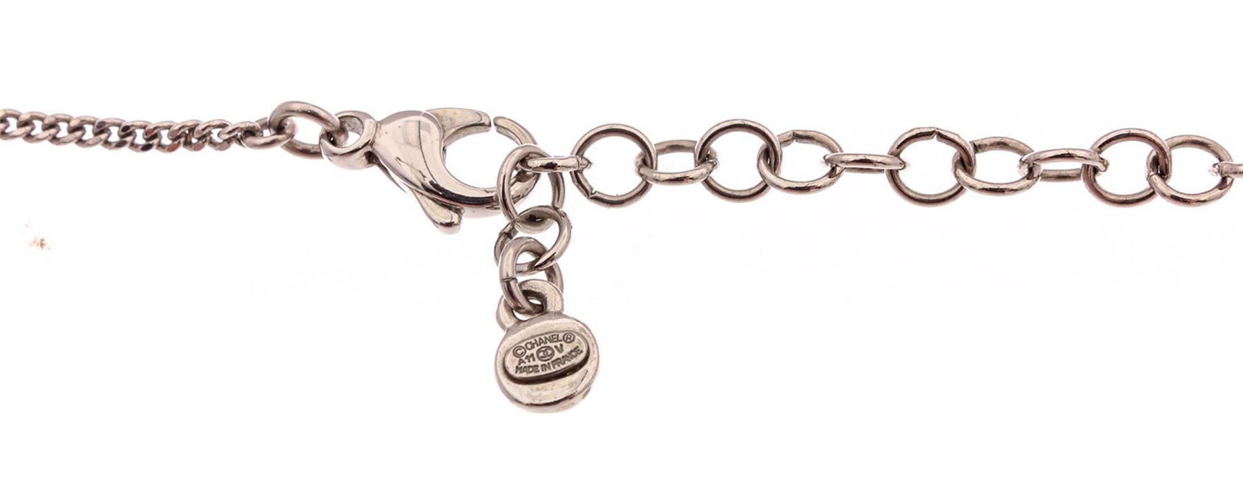 Silver-tone Chanel curb chain necklace with fixed slide pendant featuring crystal embellishments, CC ornament at end and adjustable lobster clasp closure.