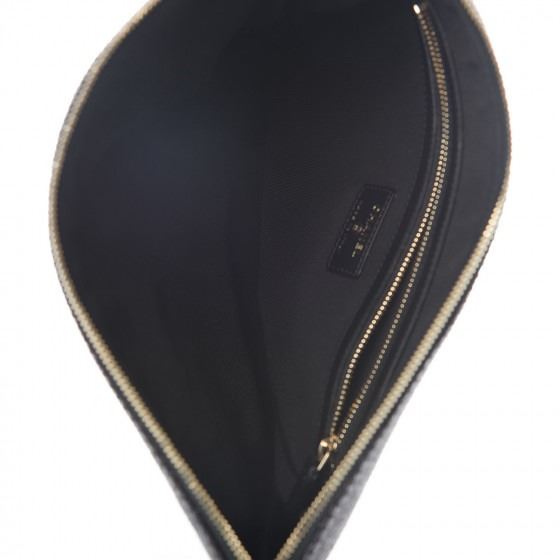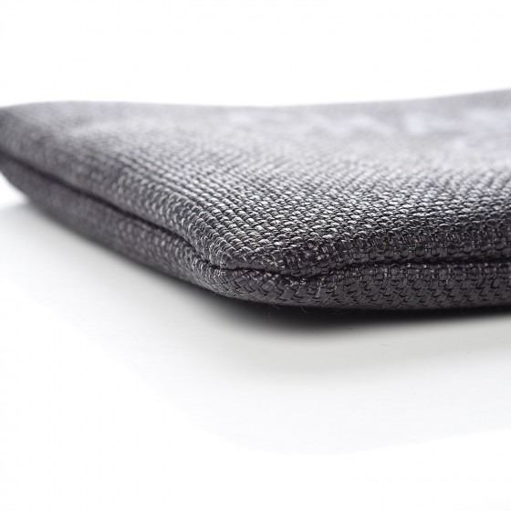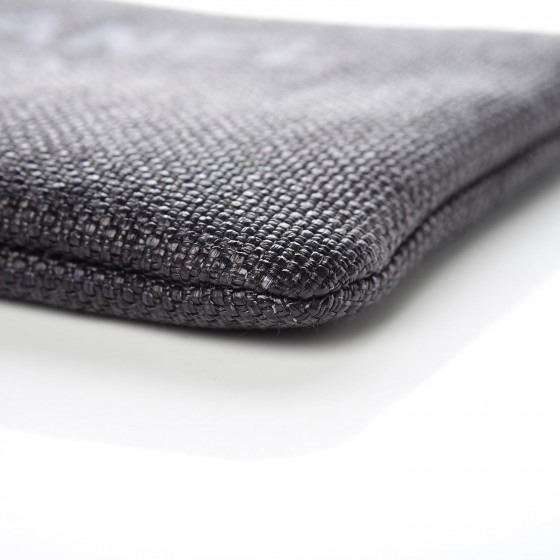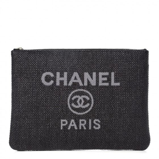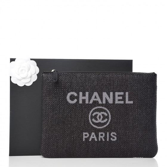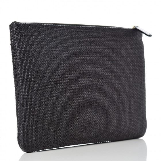 Detail: Black small clutch is designed of black straw with the CHANEL logo on the front. The top zipper opens to a black nylon fabric interior