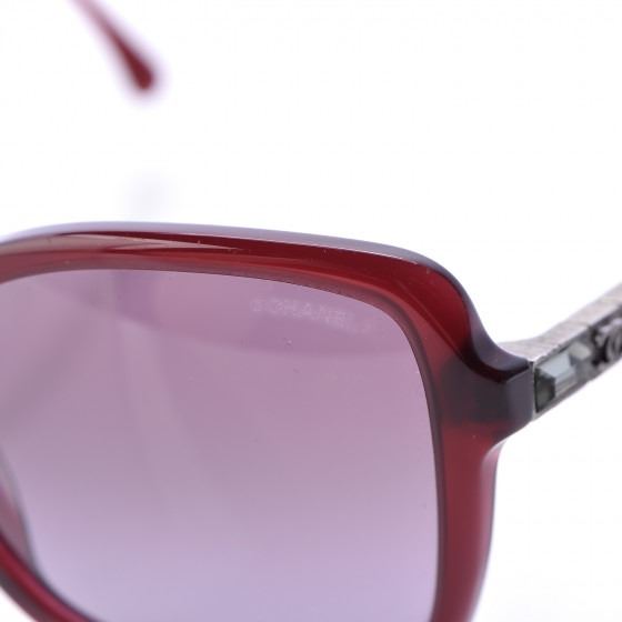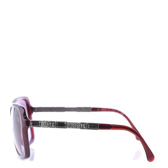 5308-B Red sunglasses have a retro burgundy frame with oversized squared rims and purple tinted lenses. The arms are beautifully jeweled with clear crystals and a Chanel CC logo for a one-of-a kind look.