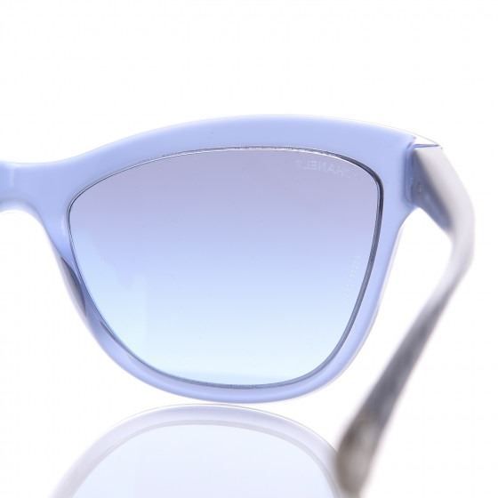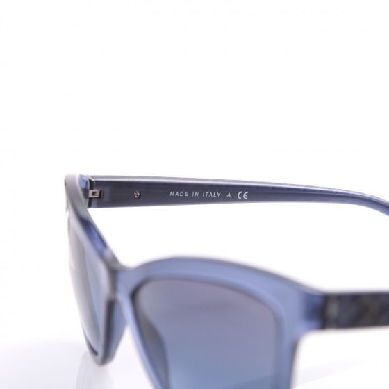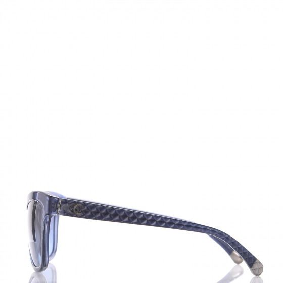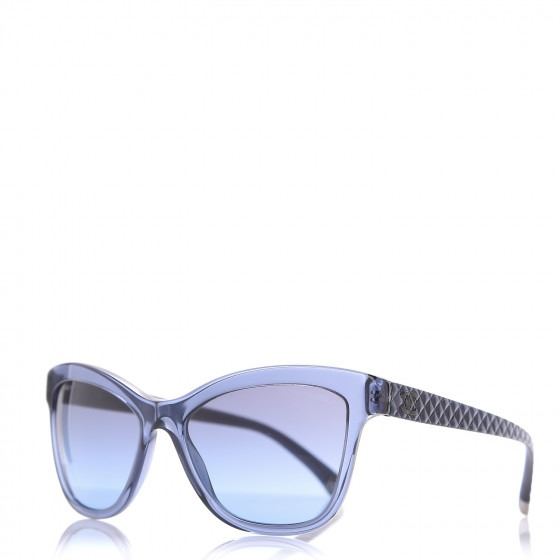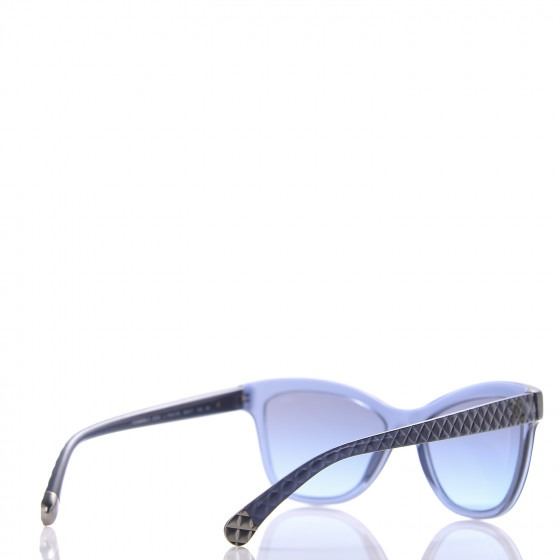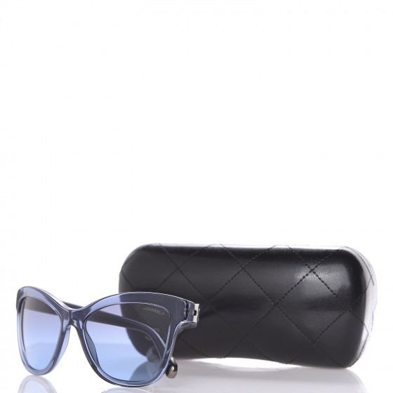 These translucent blue sunglasses have stylized cat-eye rims with blue lenses. The arms boast a quilted look and small silver Chanel CC logo at the temple and outlined with silver.