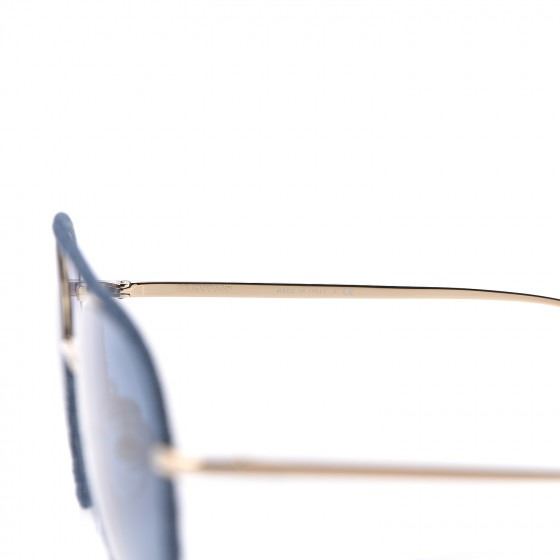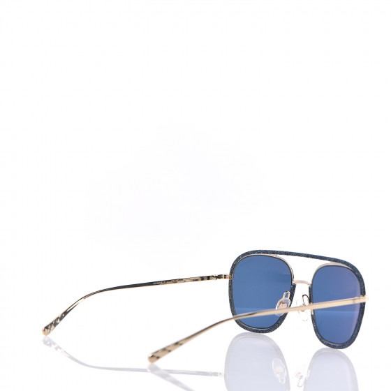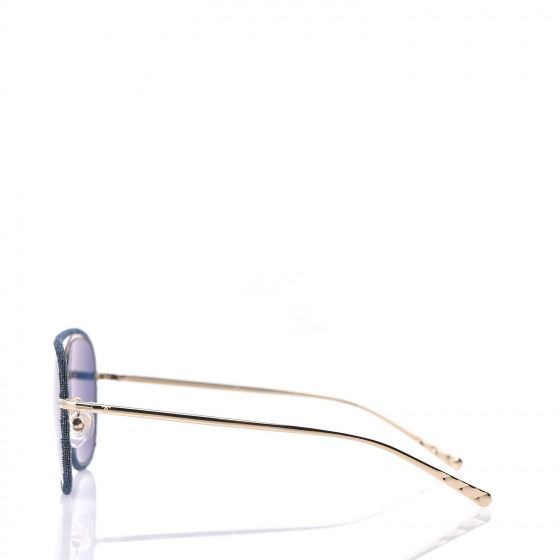 These aviator sunglasses have a thin light gold wireframe, translucent blue lenses, denim-wrapped rims, and a diamond-quilted effect on the earguards.
