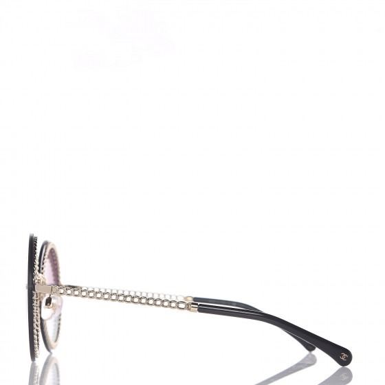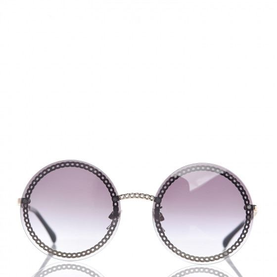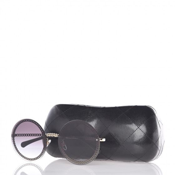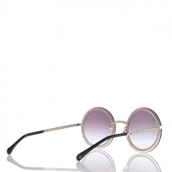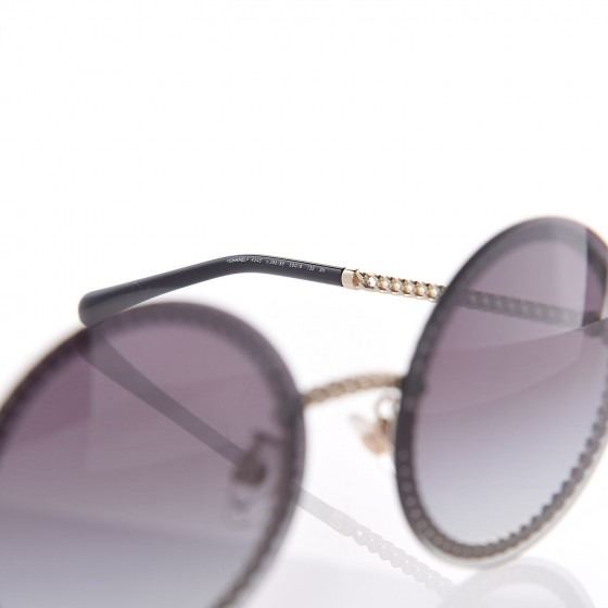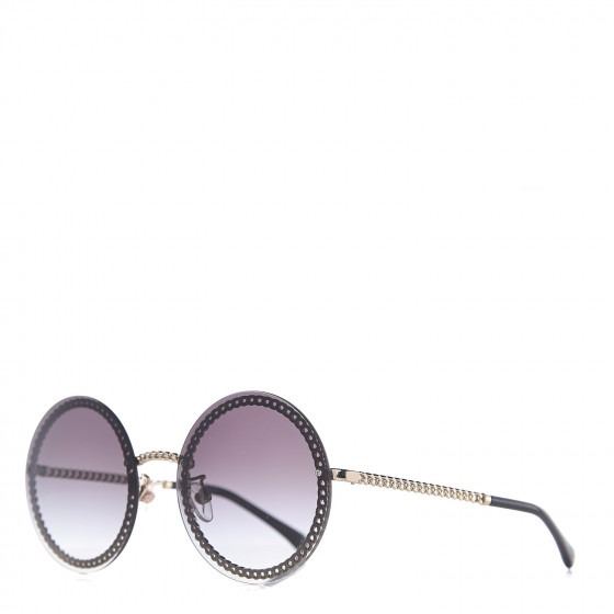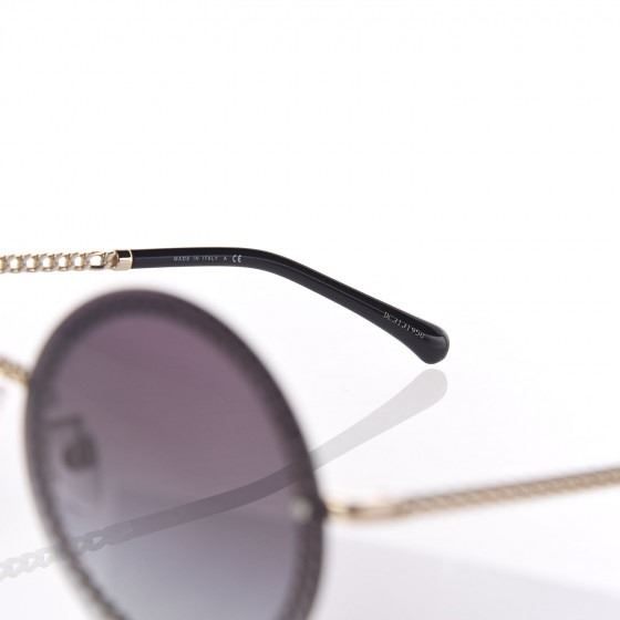 These sunglasses have retro style round dark grey lenses with a rim of gold chain. The narrow arms are a light gold chain with black tips.