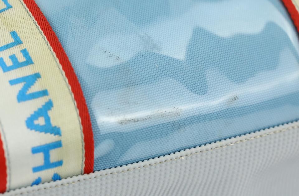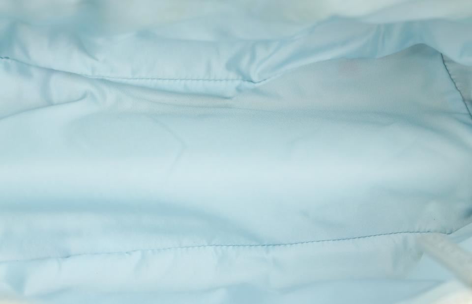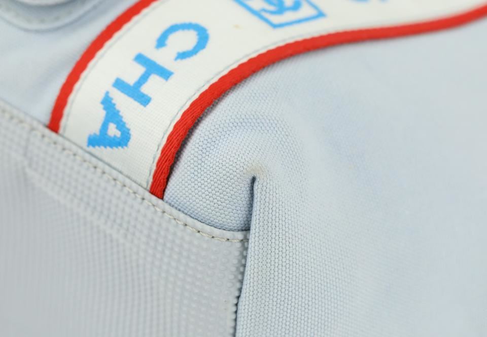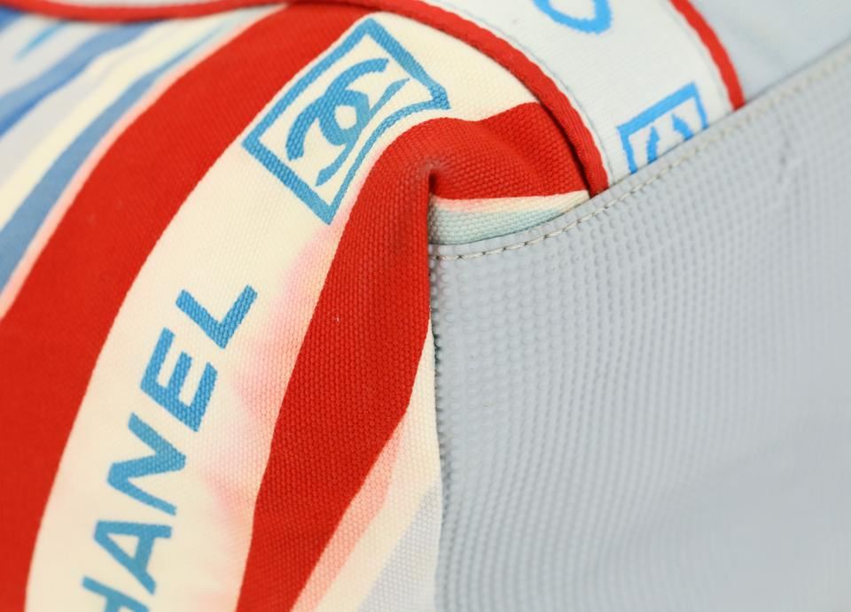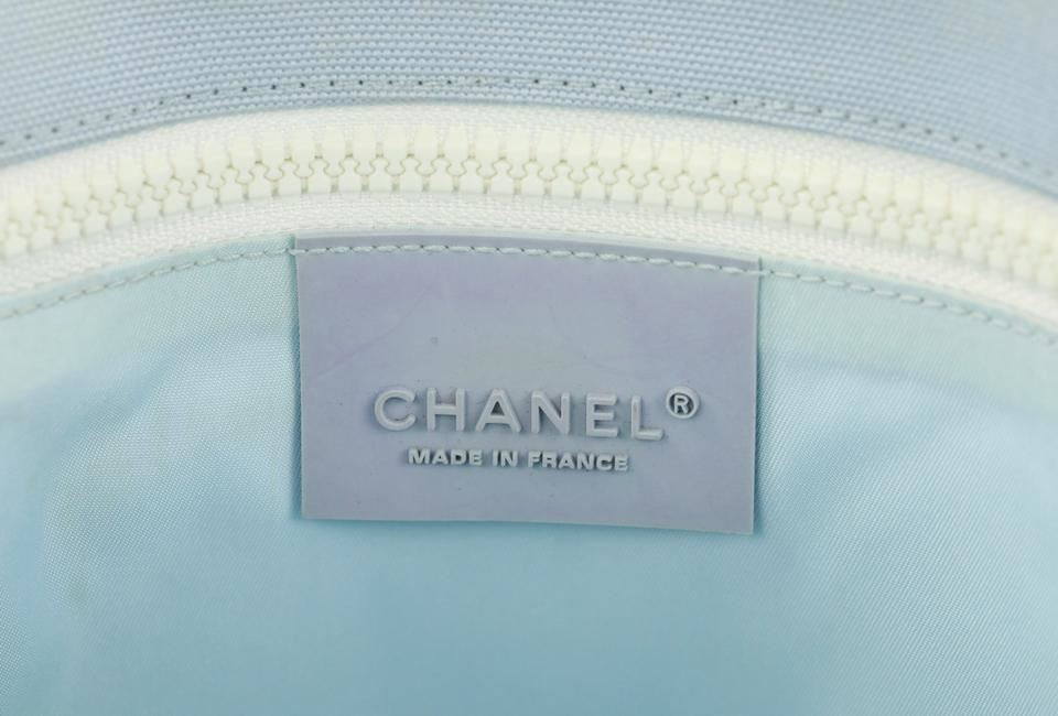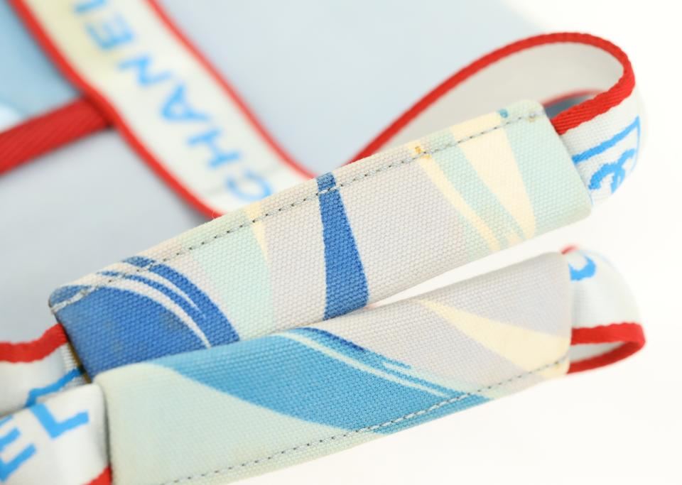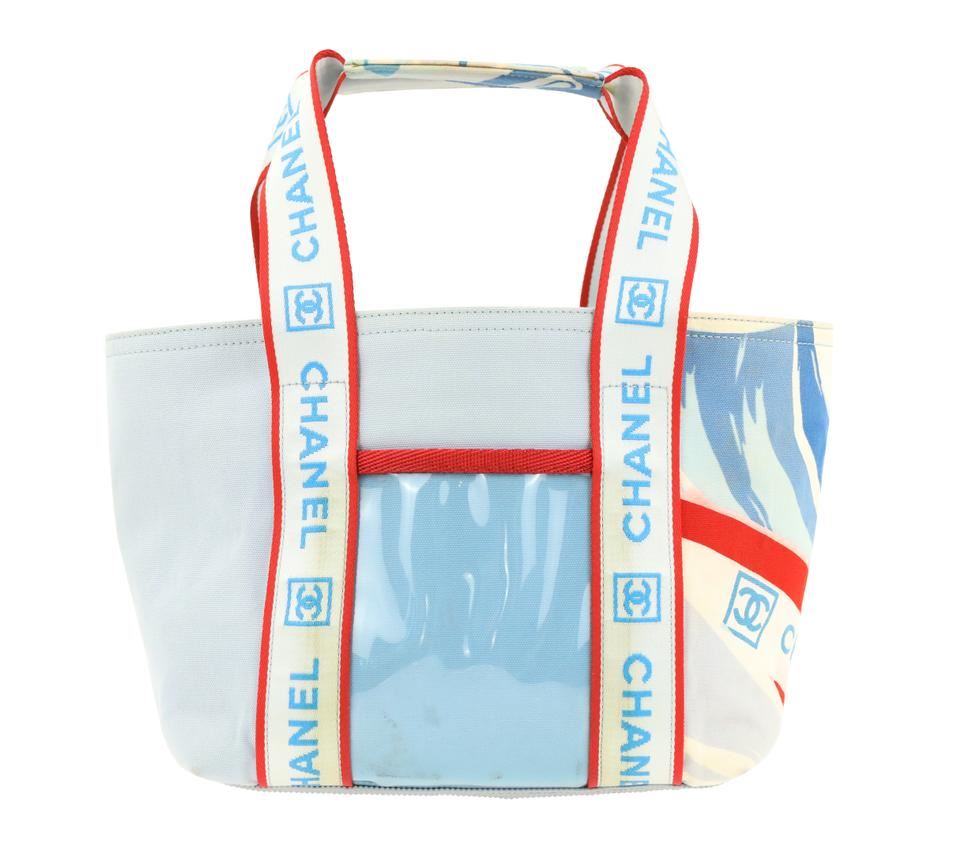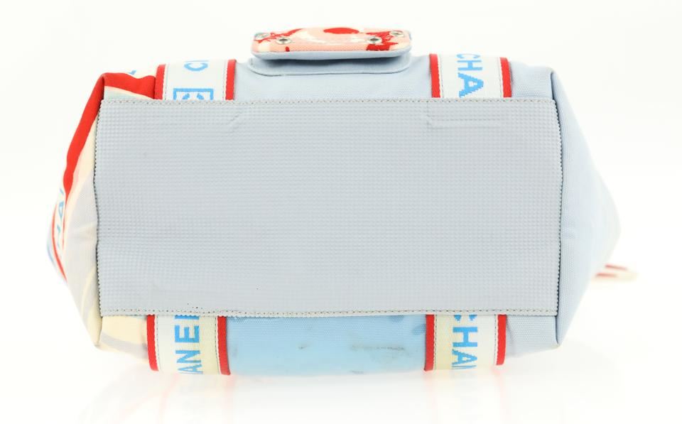 One Chanel Surf Sports Blue Canvas Tote. Chanel Surf Sports Tote ." . handle drop Light blue, blue, and red logo web handles and trim with canvas shoulder pads Solid light blue and printed (white, blue, light blue, pink, and red) canvas Bag has a softly structured shape and cannot stand on its own Blue rubber accent on the base. Open top Brushed silver-tone hardware Light blue nylon canvas lining interior zip pocket exterior flap pocket with rubber and metal pushpin closure exterior rear slip pocket with blue PVC panel Made in France